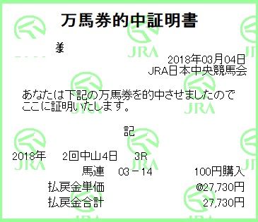 3/4 中山3R 馬連 3-14 27730円!(11人気 - 6人気)