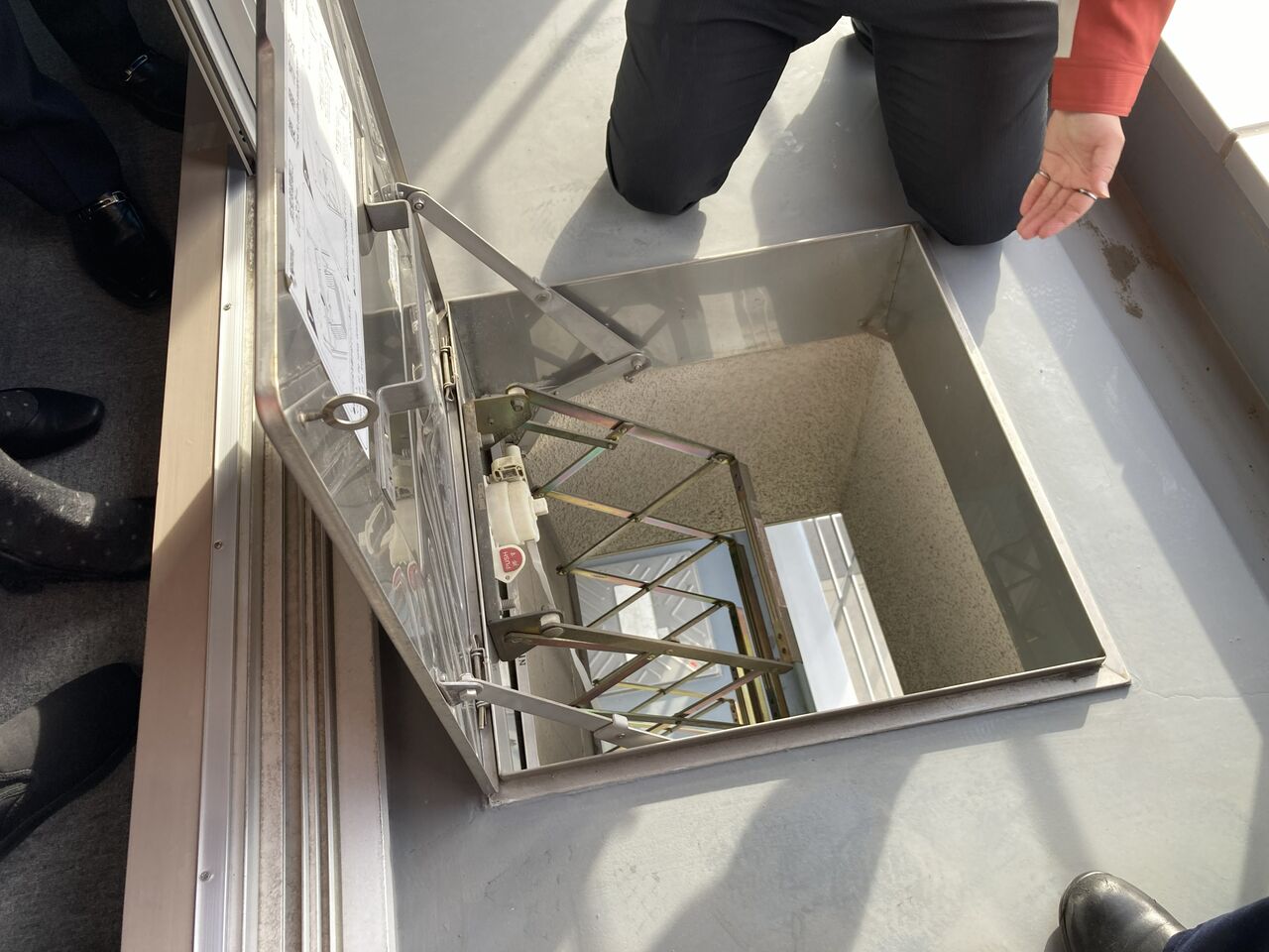 本社では、消火訓練が終わった後は5階会議室にて、避難はしごの確認や、