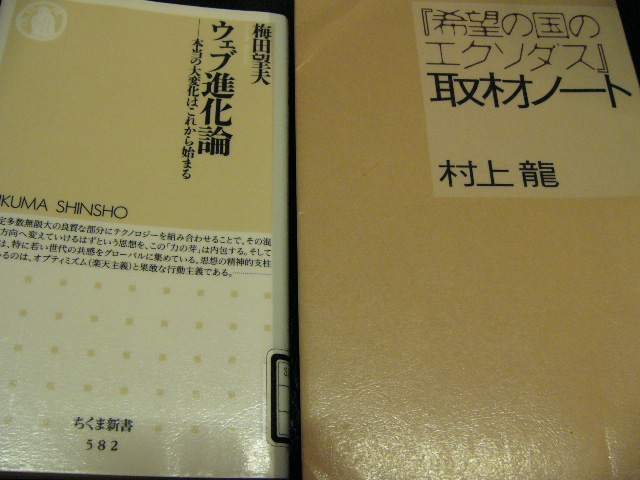 ウェブ進化論 本当の大変化はこれから始まると『希望の国のエクソダス』取材ノート『希望の国のエクソダス』取材ノートは、「近未来(2002年)を描いた2000年に出版された小説が何故今(2006年)に読んでもリアリティを感じさせるのか」との疑問がすっきりした。本物の各界の「そのスジ」の人々に対するインタビューと『希望の国のエクソダス』に対する意見を求めるのだが「村上さん、あそこはこうした方がいい」とか小説にあったあの一文につながるコメントが散りばめられており、裏話をかいまみるような愉快な気持ちになった。