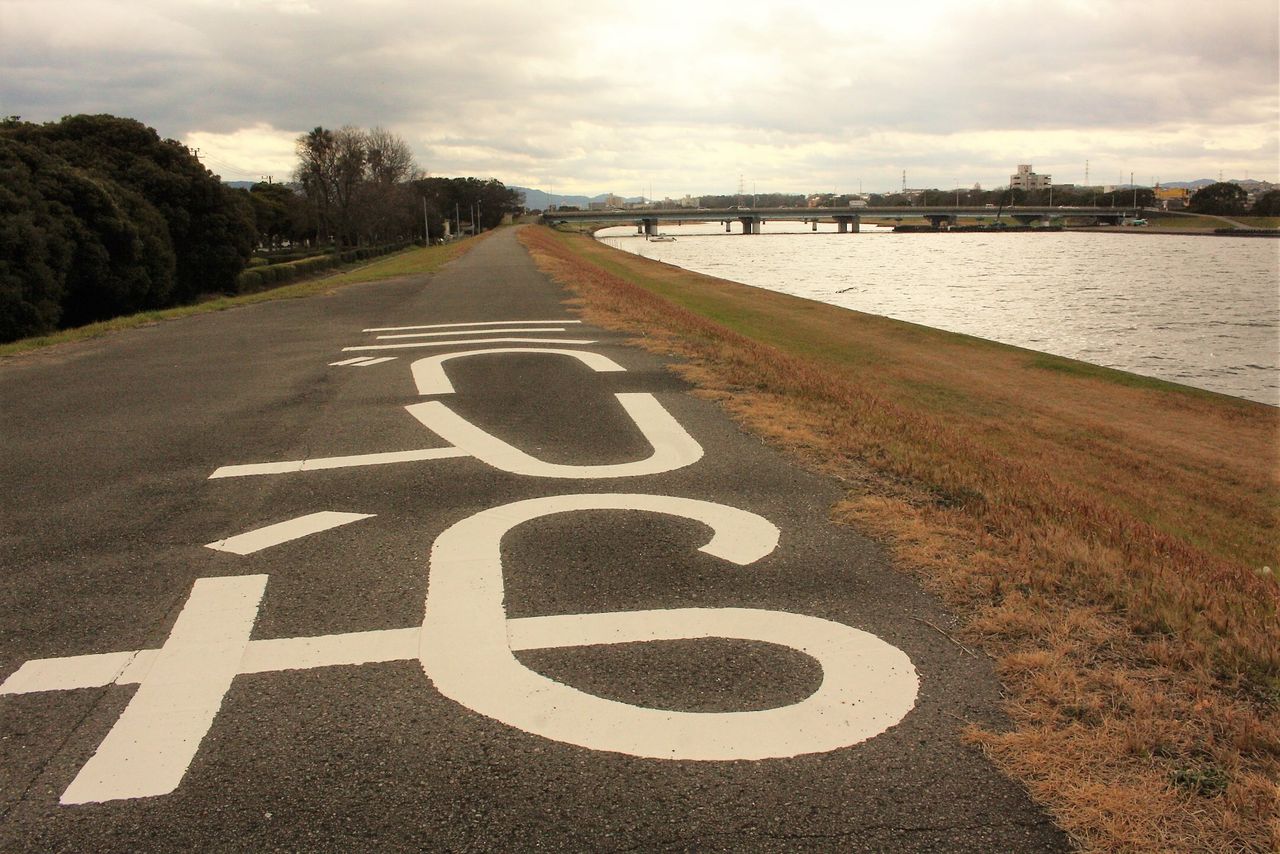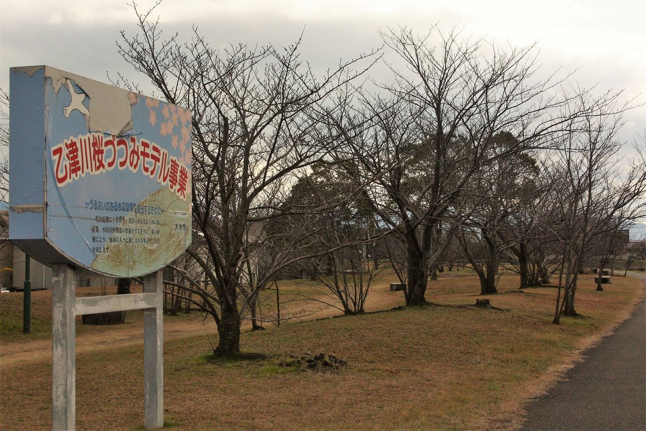 13:04 海原橋を過ぎると堤防の幅が広まり、乙津川桜づつみ の看板が立っていました。1997年の河川法改正で堤防上に桜などの植樹ができなくなりましたが、こちらは従来の堤防の外側に土を盛っているため植樹は問題なく、堤防機能の強化にも寄与しているそうです。桜の季節に歩いてみたい場所ですね。