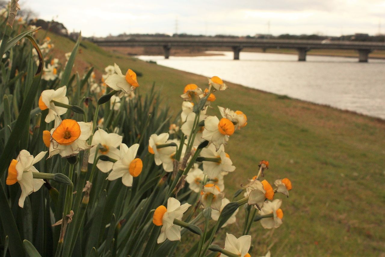 13:53 乙津川橋梁の南側の土手はスイセンの花畑。せっかくなので次の電車まで待ってみました。