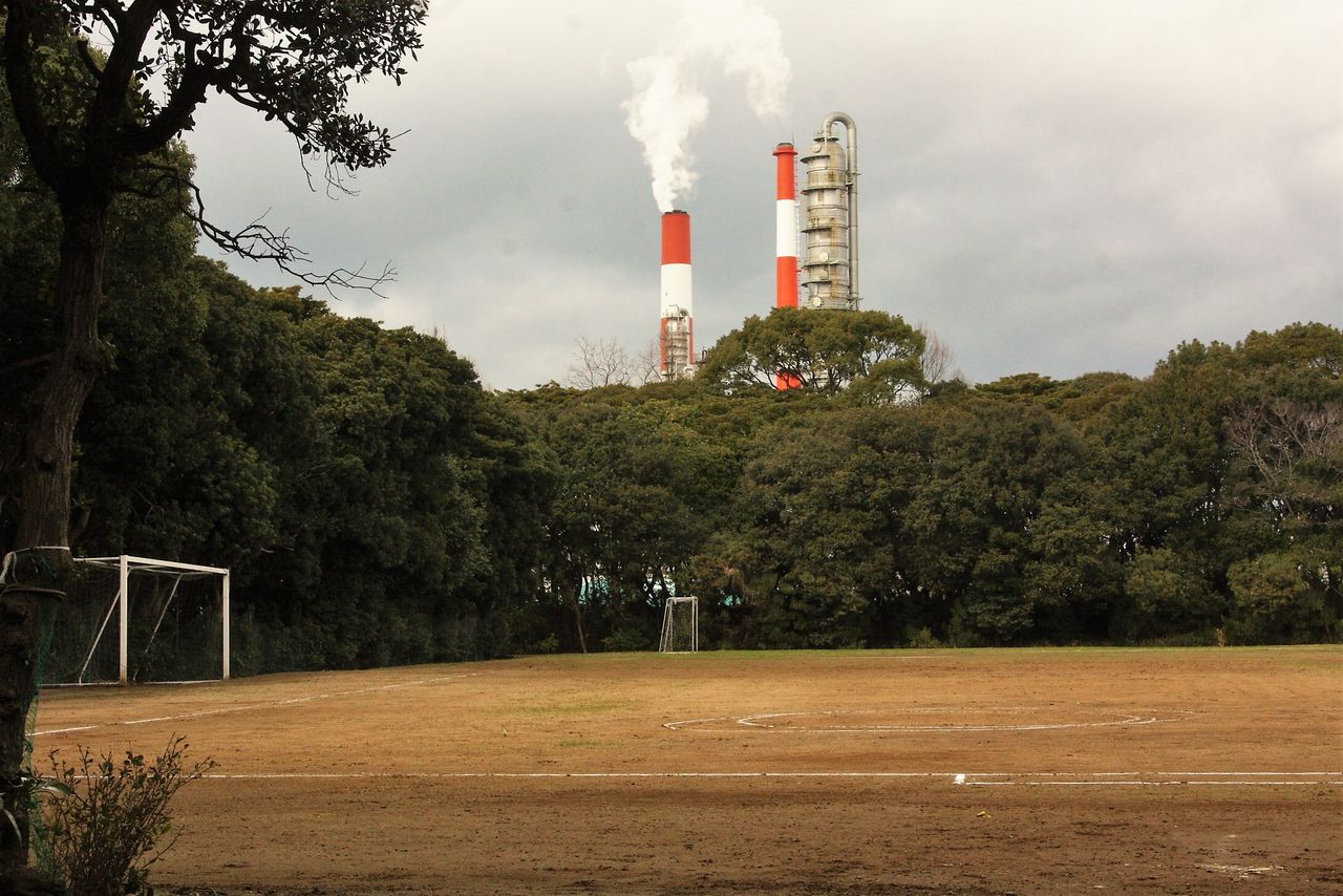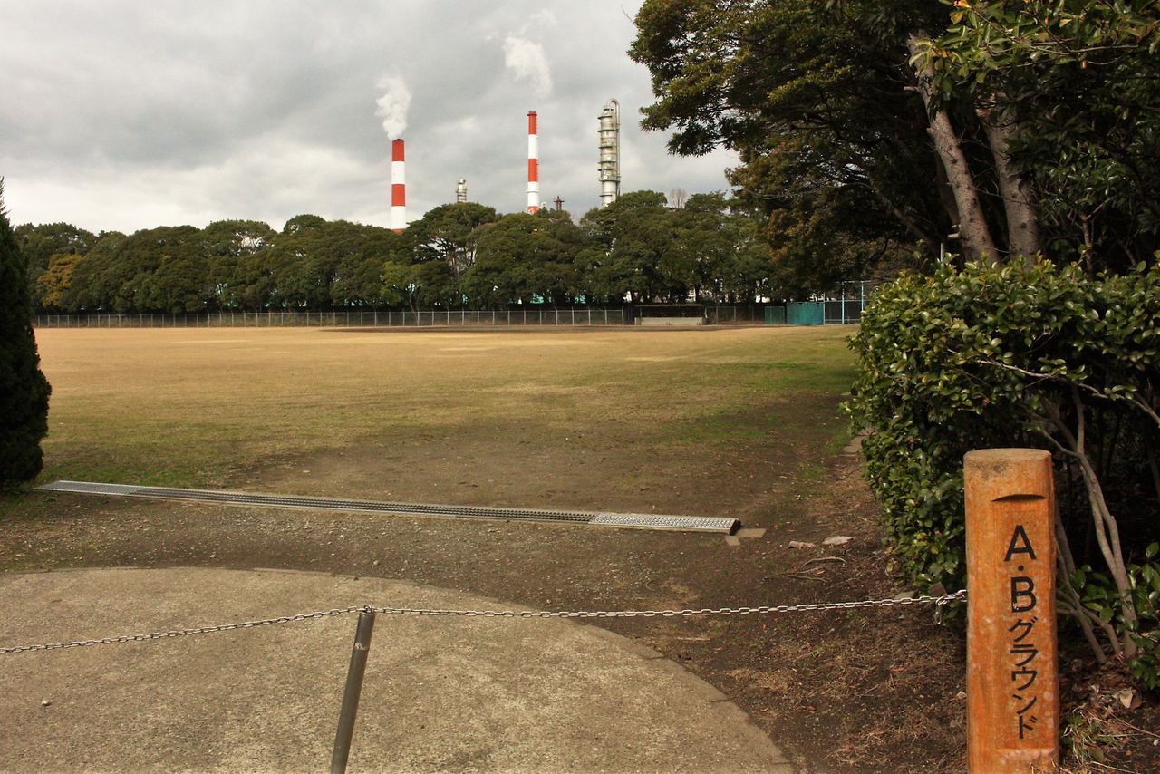 12:32 適当なところで引き返して南西方向に戻ります。緑地の北側(コンビナート側)にはサッカー兼ソフトボールのグラウンドがありました。
