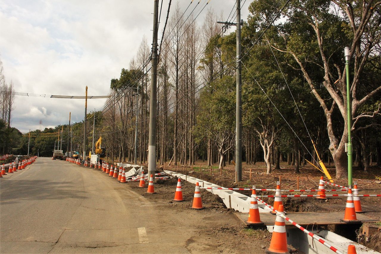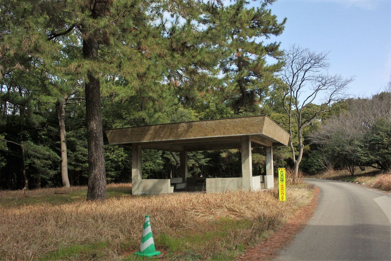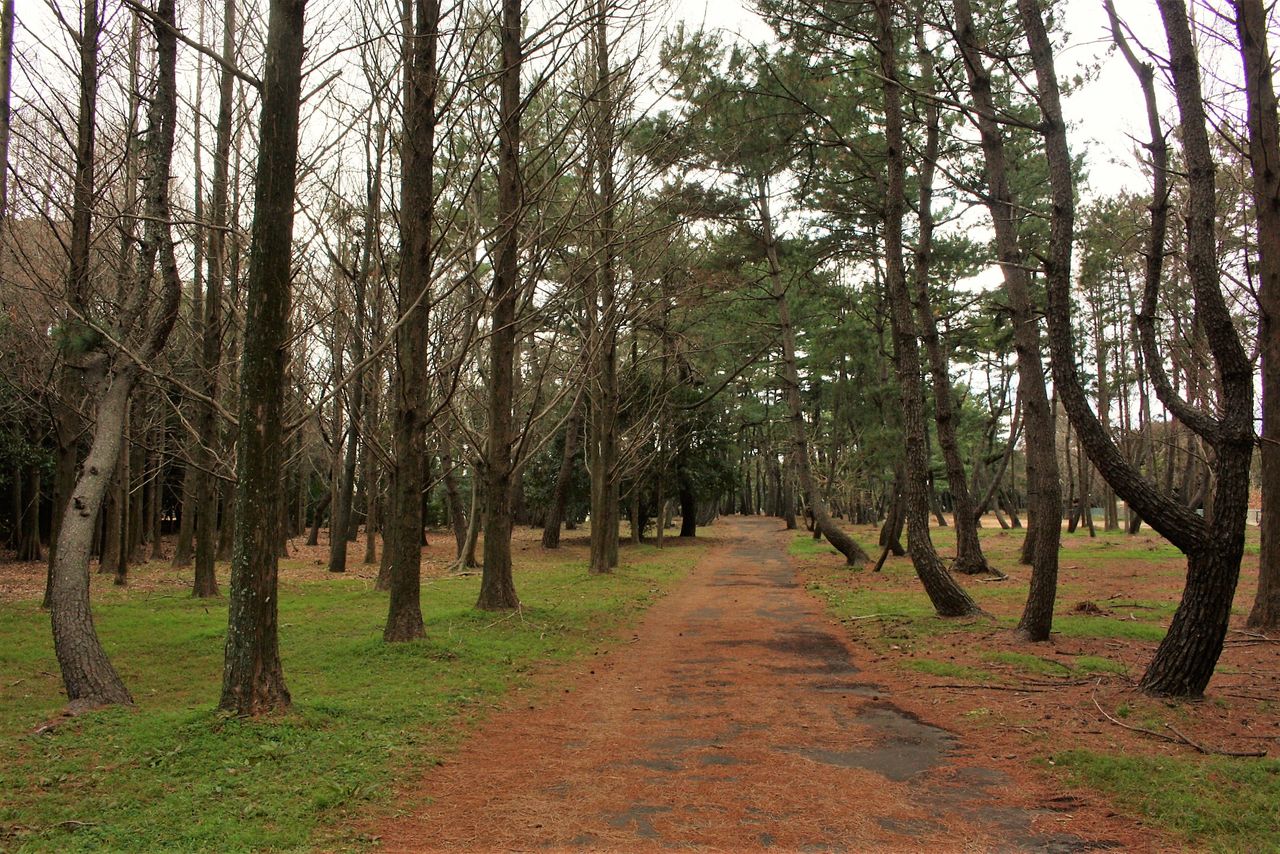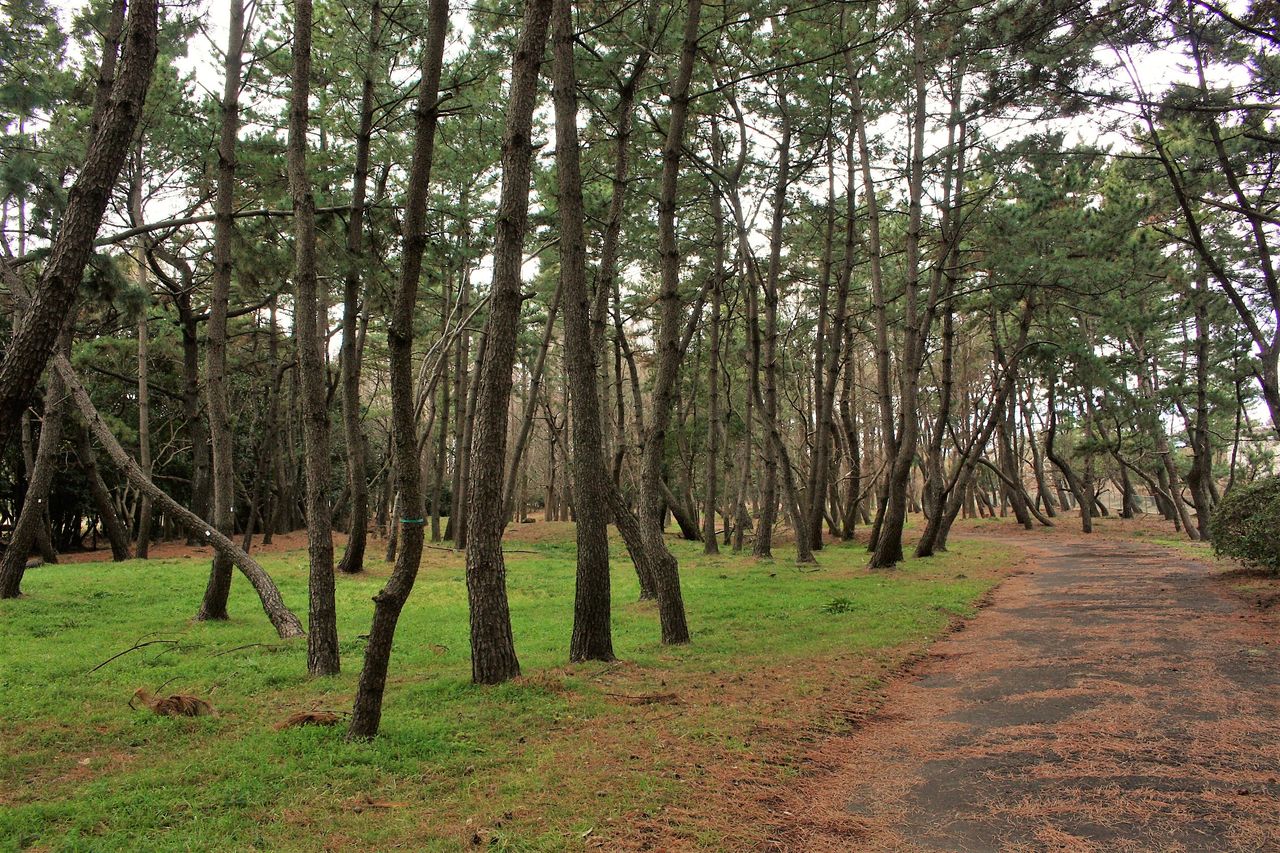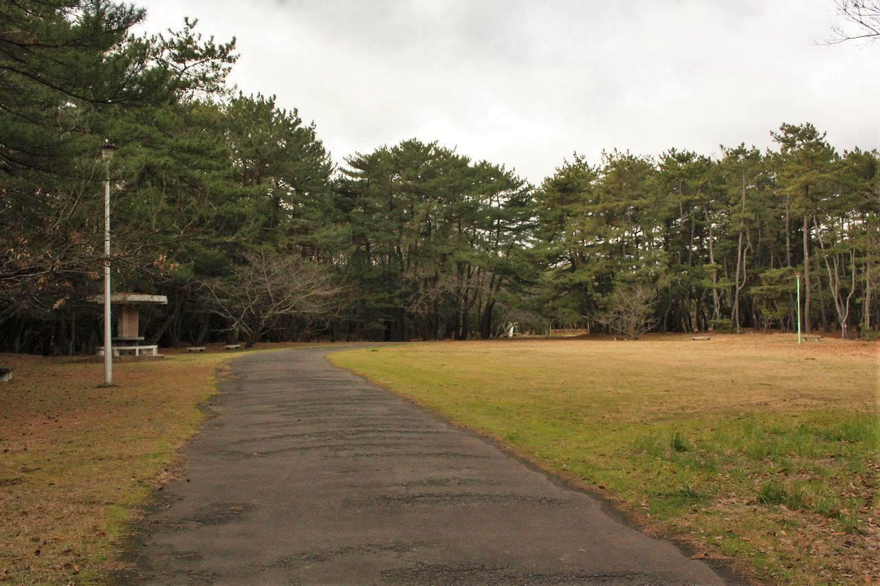 12:25 松の多い林を北東へ進んでいきます。画像の道は古くからの海岸線をトレースするものです。沿道には古めかしいトイレや休憩舎が設けられていますが、散策する人の姿はありません。