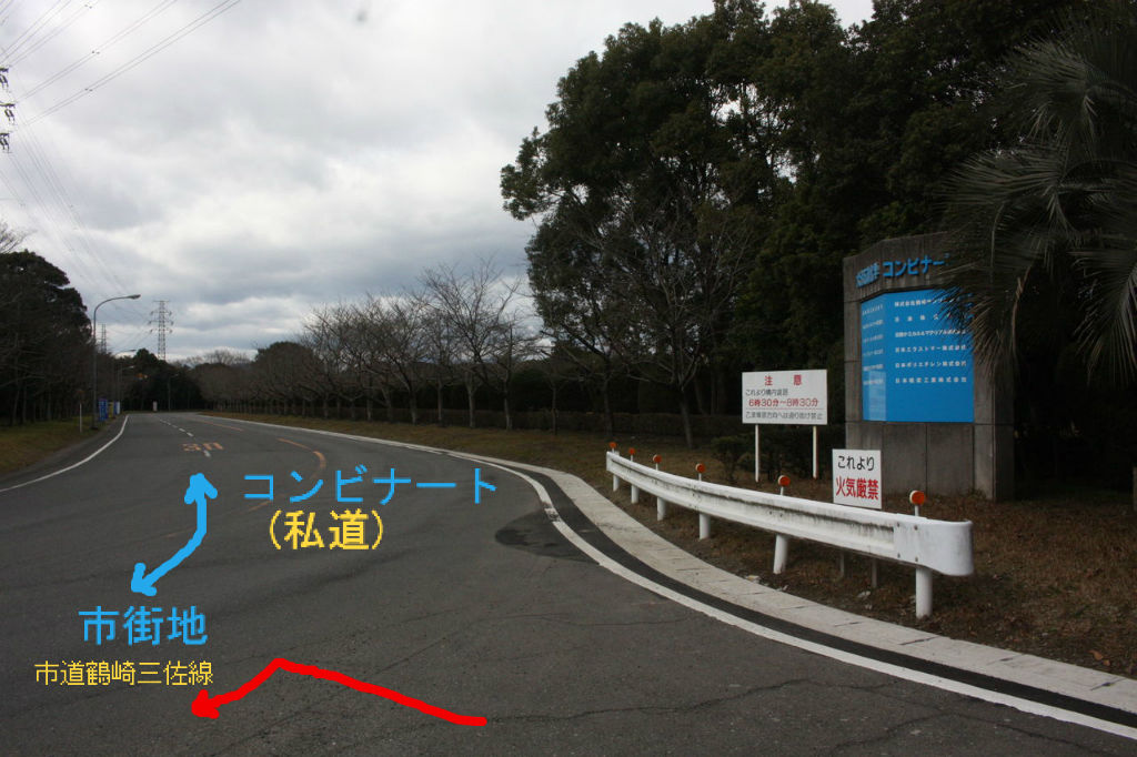 12:35 大分石油化学コンビナートの入口に出ました。ここから先は私道なので市街地方面に左折。