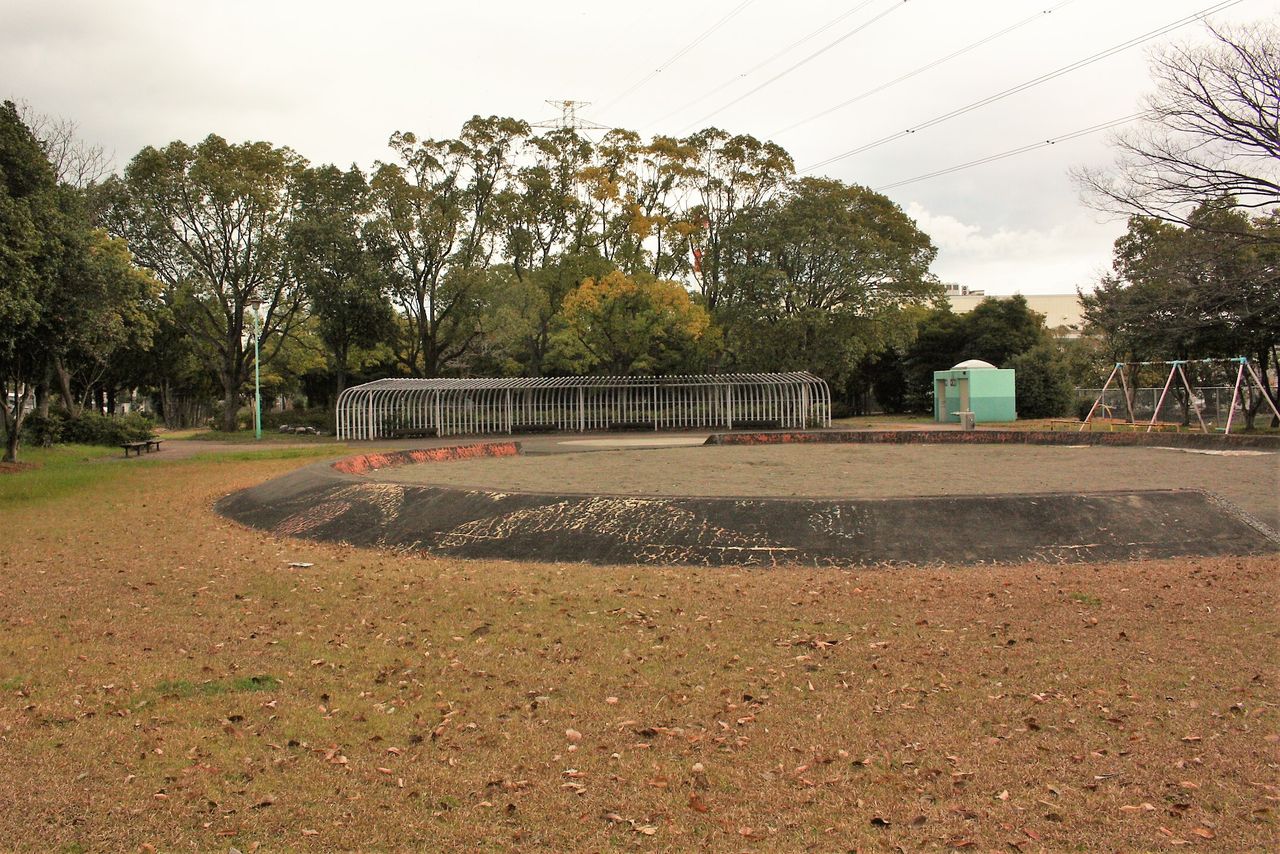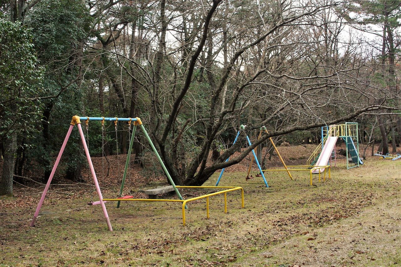 12:39 松林の中にはブランコや滑り台など昭和後期を思い出させる遊具がありましたが、遊んでいる子供の姿はありません。市街地からそう遠くない場所にあるのですが、歩いてアクセスできる距離ではありません。どうせ車に乗って行くなら、最新の遊具がそろった鶴崎スポーツパークや佐野植物公園が選ばれるのでしょう。こちらのトイレは入るのにちょっと勇気が必要なタイプですし。