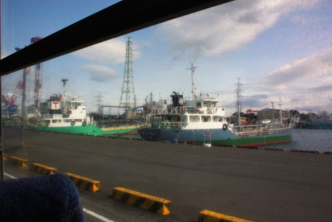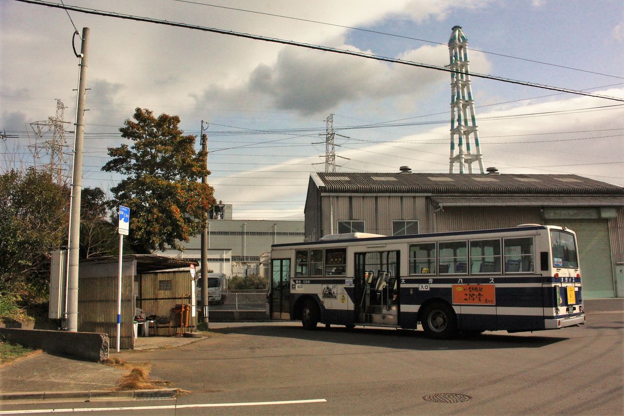 12:06 家島橋の手前で臨海産業道路と分かれたバスは小中島川(鶴崎第2埠頭)に沿った道を北上します。江戸時代から続く港町というより新産都の港湾といった風景ですが、大分市内で港の見える路線は貴重です。