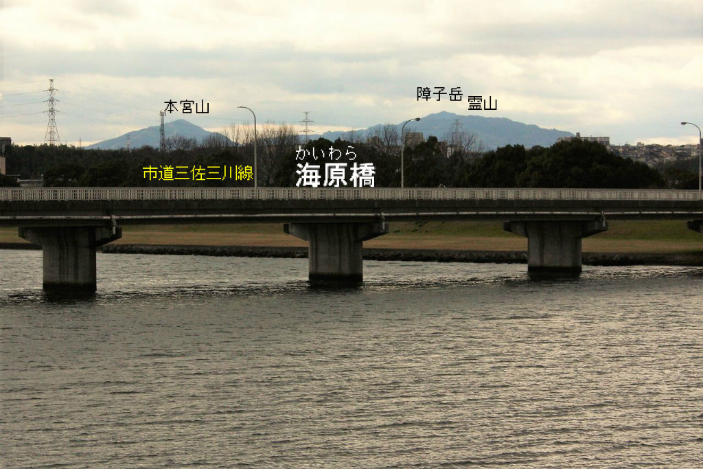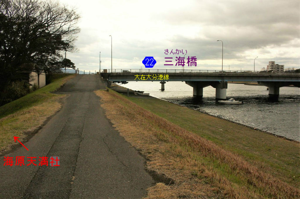 12:57 先ほどバスで通過した臨海産業道路(40m道路)の三海(さんかい)橋とクロスします。竣工は1970年頃のようですが、名前の由来は両岸の三川(みつがわ)と海原(かいわら)に因んだものでしょうか? なお、橋のたもとには横断歩道がないため左手の海原天満社を経由して道路の下をパスすることにします。