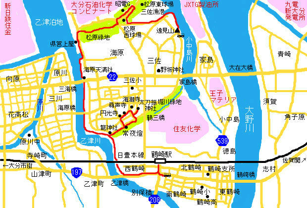 ただし、遠見山“登山”だけでは物足らないと思いますし、適度なウォーキングも楽しみたいので、松原緑地公園を抜けて乙津川沿いに鶴崎駅まで歩くことにしました。その際、藩政時代の歴史を感じられるスポットにも立ち寄ってみたいと思います。