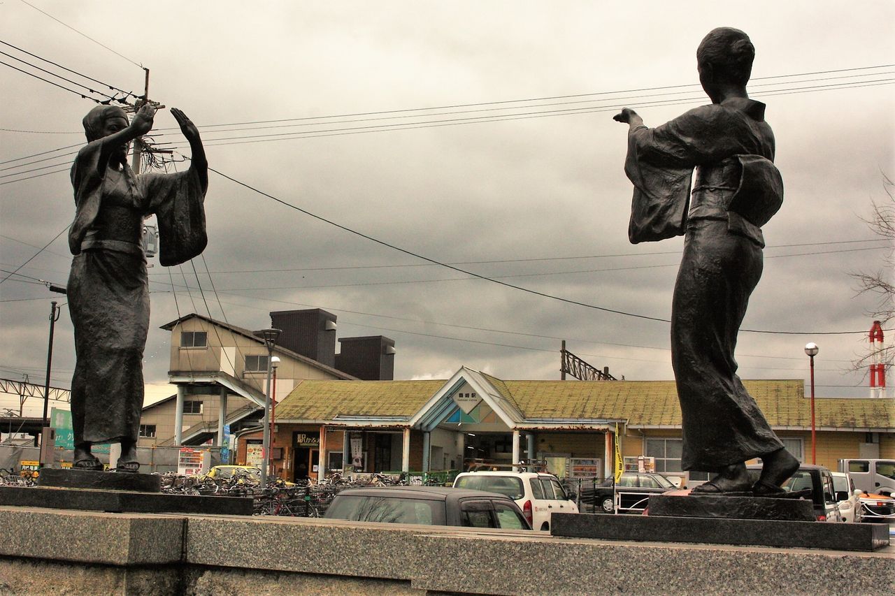 14:06 JR日豊本線 鶴崎駅に到着。当地で400年以上の歴史を持つ鶴崎踊のモニュメントが迎えてくれました。