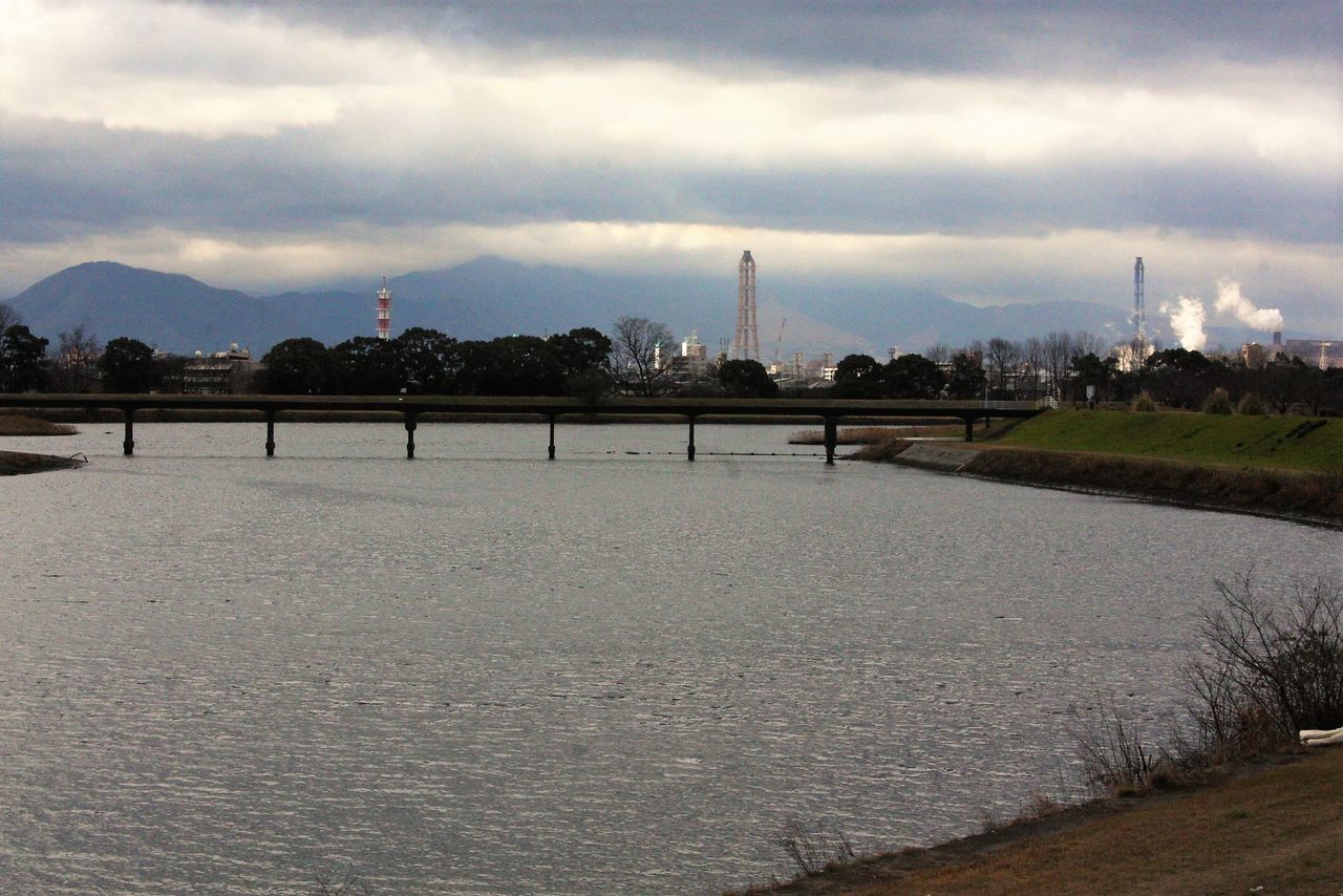12:53 乙津泊地の南端で乙津川の右岸堤防に上がります。振り返ると別府湾の向こうに国東半島の山々が見えていました。