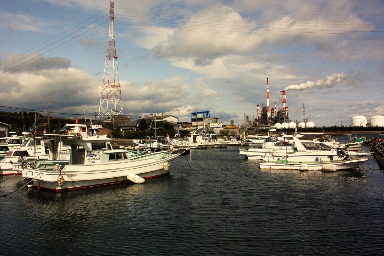 12:17 三佐漁港から眺めた製油所。参勤交代の船が発着していたのはもう少し内陸側(小中島川の上流側)のようですが、岡藩 中川公参勤交代の船団や大坂からの廻船が出入りしていた時代がしのばれます。