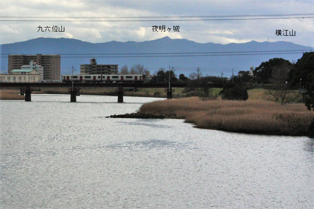 13:08 前方に日豊本線 乙津川橋梁、その奥に先日登った九六位山系が見えてきました。