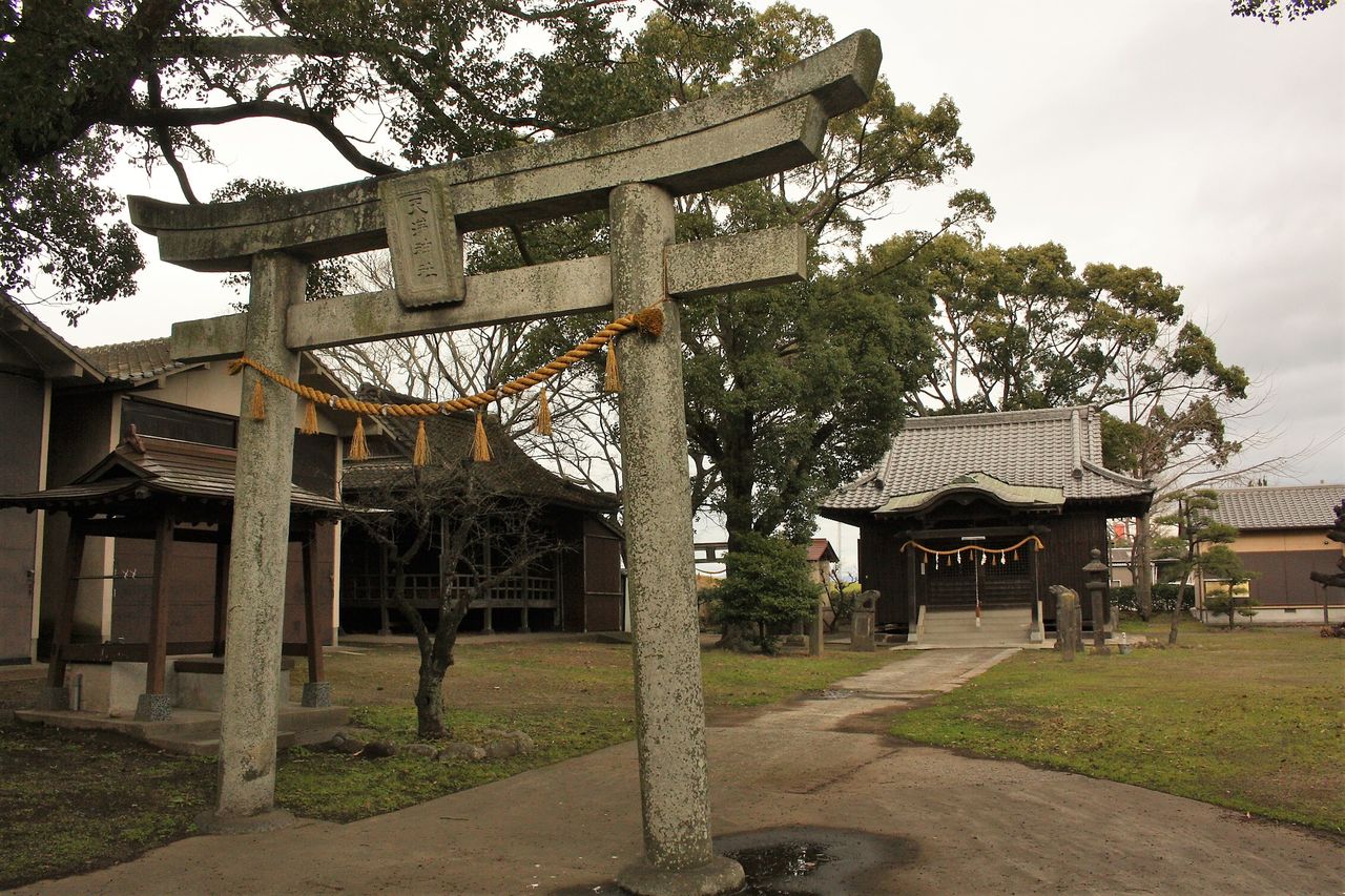 菅原道真を祀り、古くから海原の鎮守様として崇敬を集めていますが、創立年月は不詳。大祭には山車が御輿のお供をして新町の龍神社まで御神幸が行われ、御輿が社殿に還御すると、境内で角力を催すのが例となっています。
