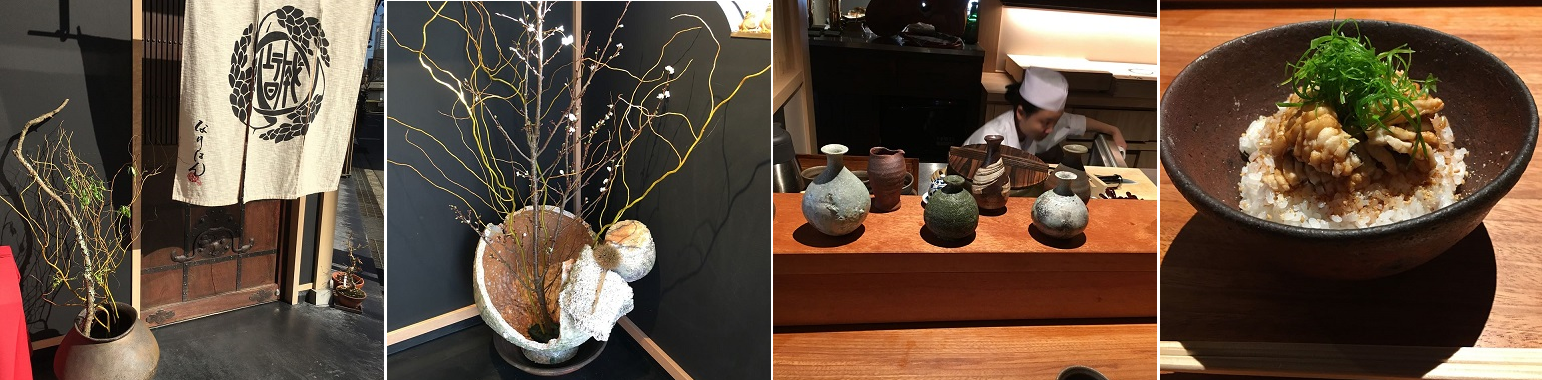 趣のあるお店「なりはん」が、「昼懐石」や「穴子丼ぶり」のお品書きに、ここでお昼ご飯にしました。暖簾のくぐると陶器のオブジェが!ミトさんが「これは、信楽焼きの辻村史郎氏の作品では?」ご主人にお聞きしたら、辻村氏の作品でした。座ったカウンターの前にも信楽焼きの徳利が並んでいます。この穴子丼ぶりの器も信楽でしょう。