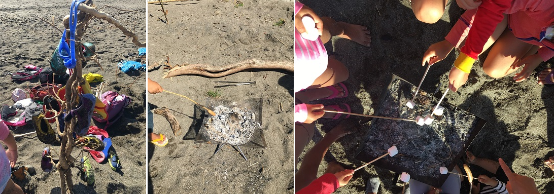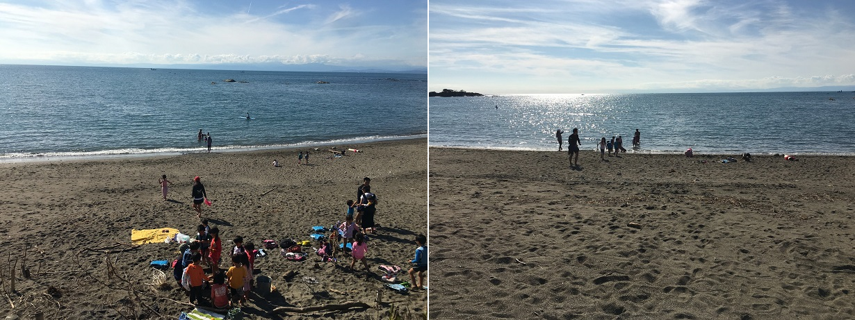 泳いで子、浜辺で波と戯れている子、ソーセージを焼いている子、みんなで火を囲みマシュルームを焼いている子供と先生たち。漂流の木でしょうか?立てかけた枝には靴やカバンが掛けてあります。どの子も生き生きと遊んでいるこの空間に何とも言えない温かみを感じました。先生に「どこの保育園ですか?」と尋ねたら「横浜の〇〇の森幼稚園です。」とニコニコ教えて下さいました。