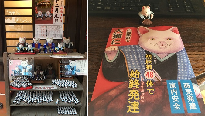 月の始めの辰の日に「初辰日」に小猫を一体集る。奇数日には左手招き猫「家内安全」、偶数月には右手の小猫「商売繁盛」