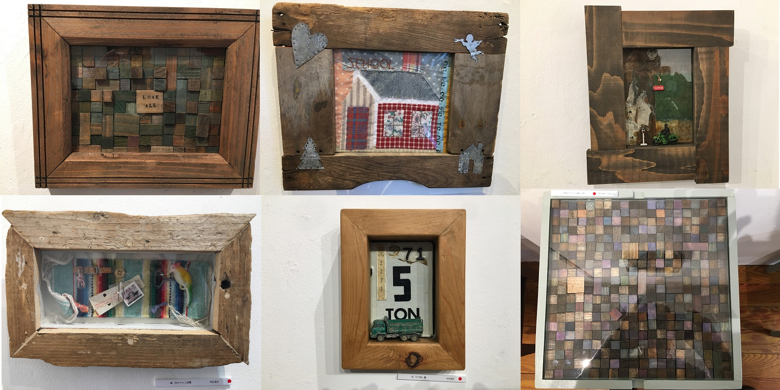 流木や木造船の一部、昔アメリカや外国で集めたレシートやメニューや古い玩具も作品に