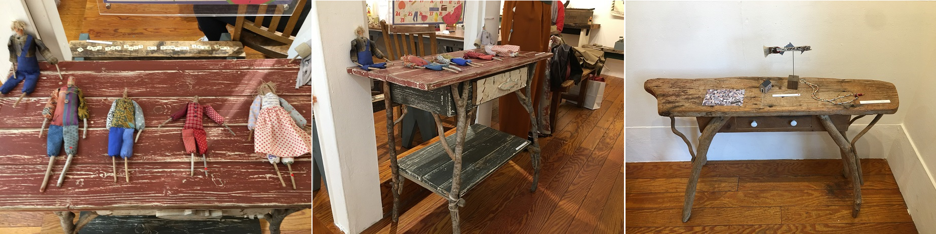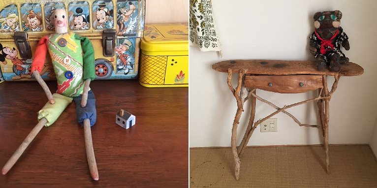 流木の家具やこの人形たちは三重子さんの作品