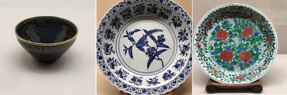 「油滴天目茶碗(南宋時代12〜13世紀)」「青花枇杷鳥文盤(明1403 ̄1424)」「五彩ボタン文盤(明1573〜1620)」
