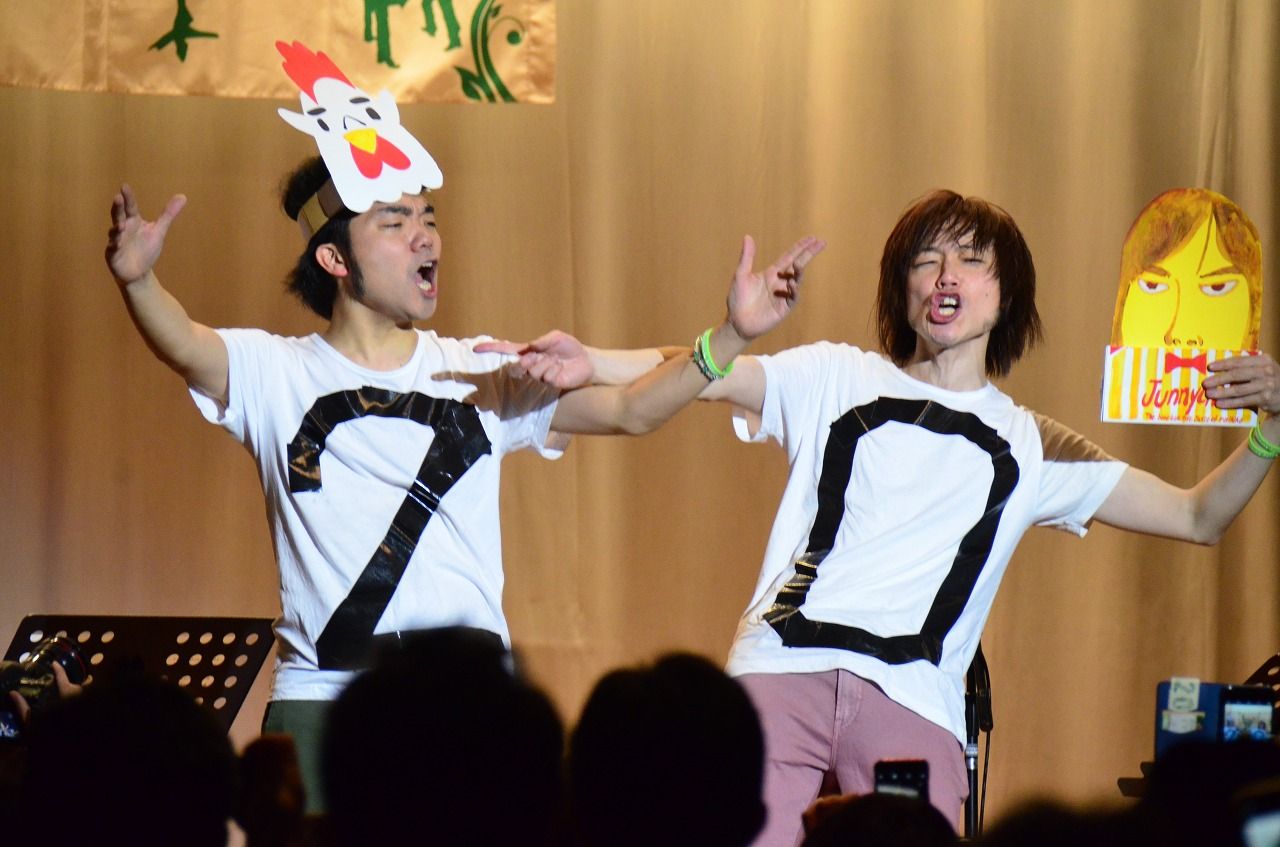 ちなみにDANNYがカラアゲ君、自分がファミチキ(ジュニチキ)、ギターソロでは会場に突撃、お面の一部をめくって自分の顔が出てくるという仕掛けに加えて、ギターを持ち変えて2人ともフロア後方で歌うという演出で盛り上がりました。