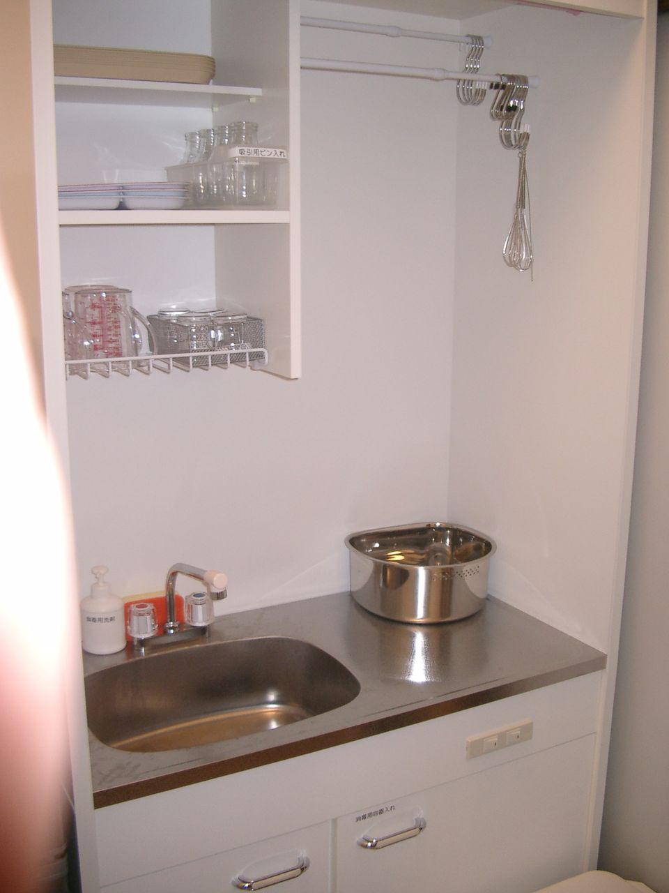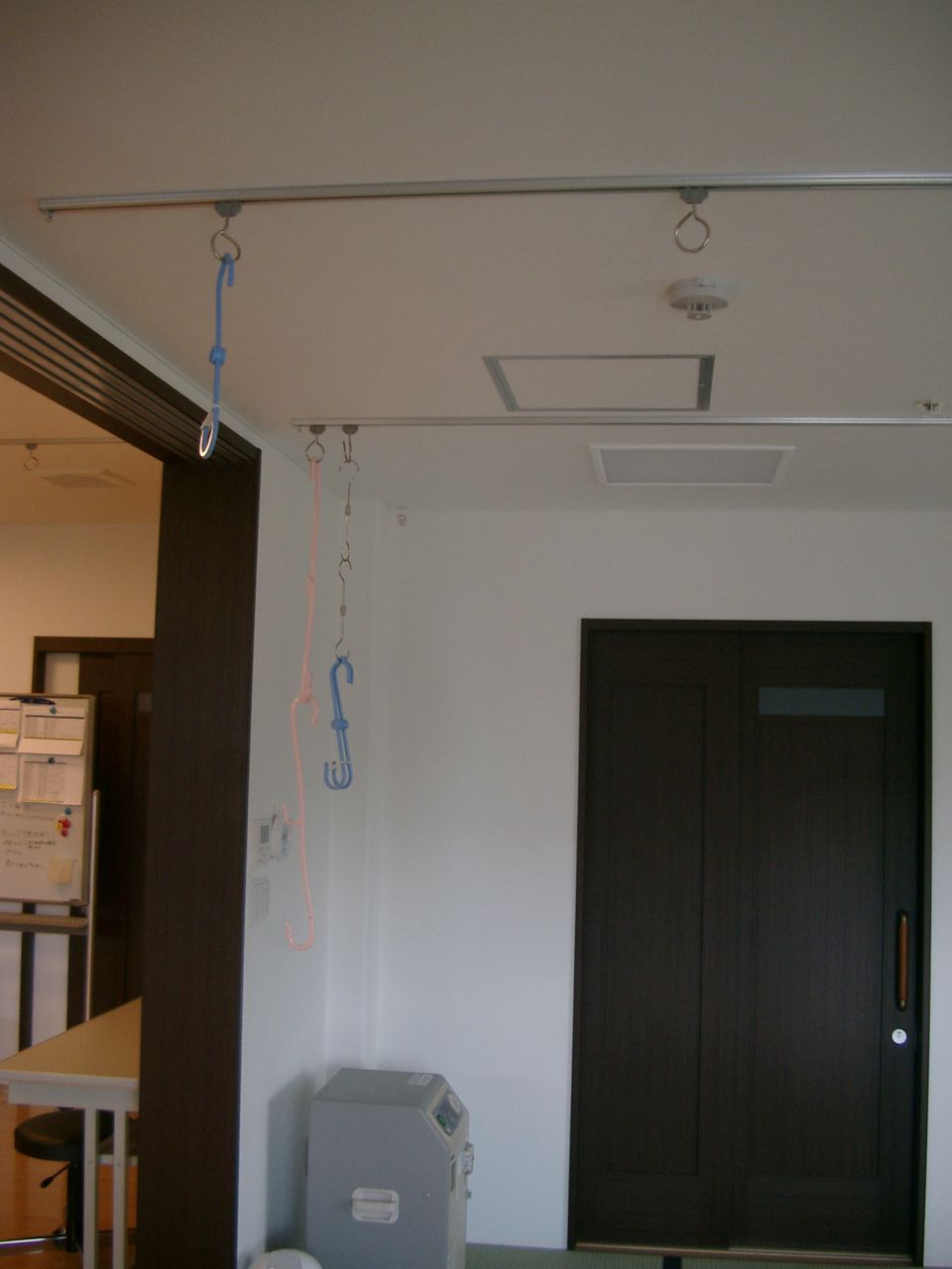 天井には注入ボトルを下げられるようフックとレールが設置されています。(奥に酸素の装置も見えますね)