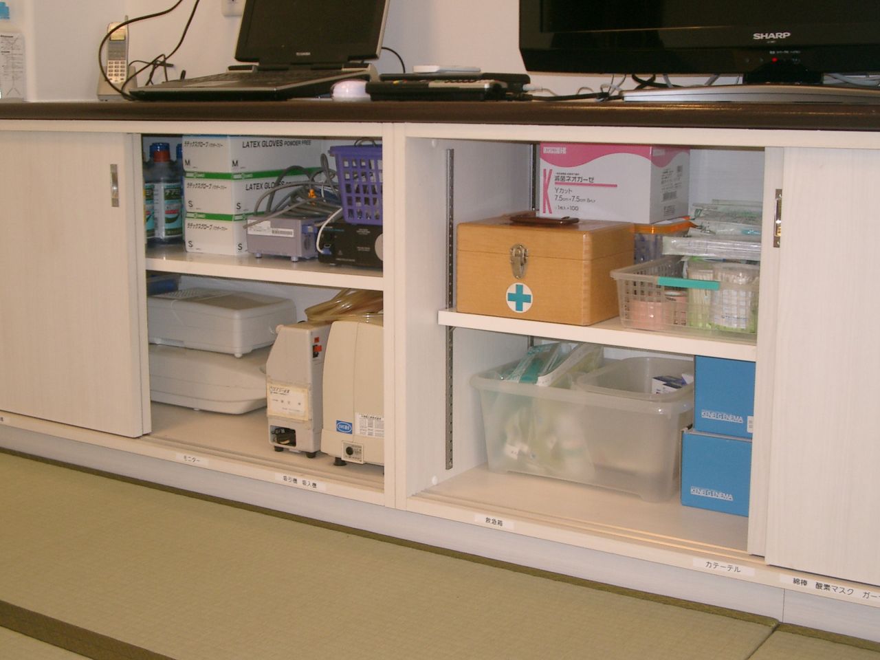 IH完備のキッチンとは別に、注入の準備をするためのミニキッチンも独立して設置されていたり、畳スペースの棚には吸引機や医療的ケアに必要な物品がぎっしり。重心の方の利用が多い、しぇあーどさんならではの心遣いと工夫ですね。