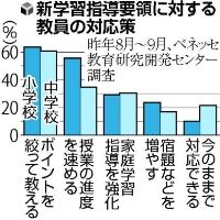 次いで「授業の進度を速める」が小55.4%、中34.5%。「家庭学習指導を強化」は小28.7%、中30.2%。「宿題などを増やす」小23.3%、中16.5%と続いた。一方、「今のままで対応できる」とした教師は小9.8%、中21.0%にとどまった。