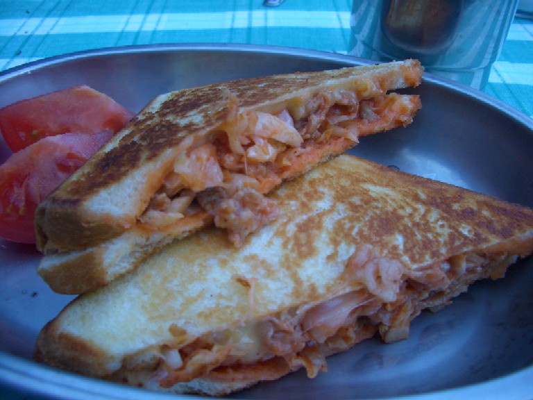 あは〜*ホットサンド、ホットサンド焼くフライパンみたいなのに挟んで、イワタニのガスコンロ(やじおが釣りの準備の写真で右横にチラット見える)で弱火で焼いてるよ!これでいい??(笑)
