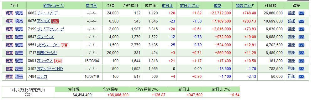 今週はチャームケアの株価が持ち直したため、含み益が好転しています。