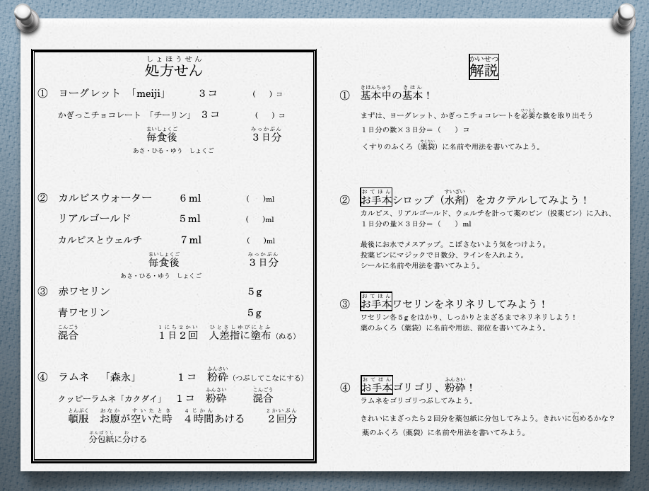 マンツーマン形式で、キッザニアの5倍くらい本格的な調剤体験で、かなり難しかったようですが、