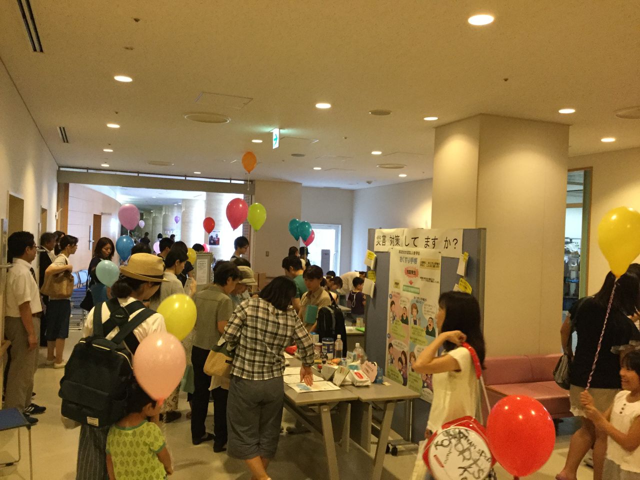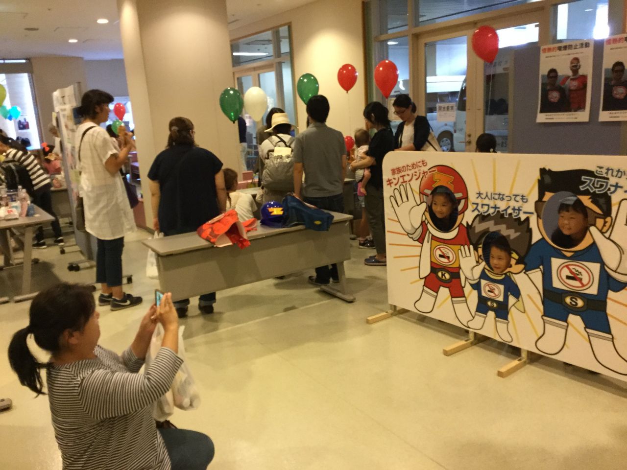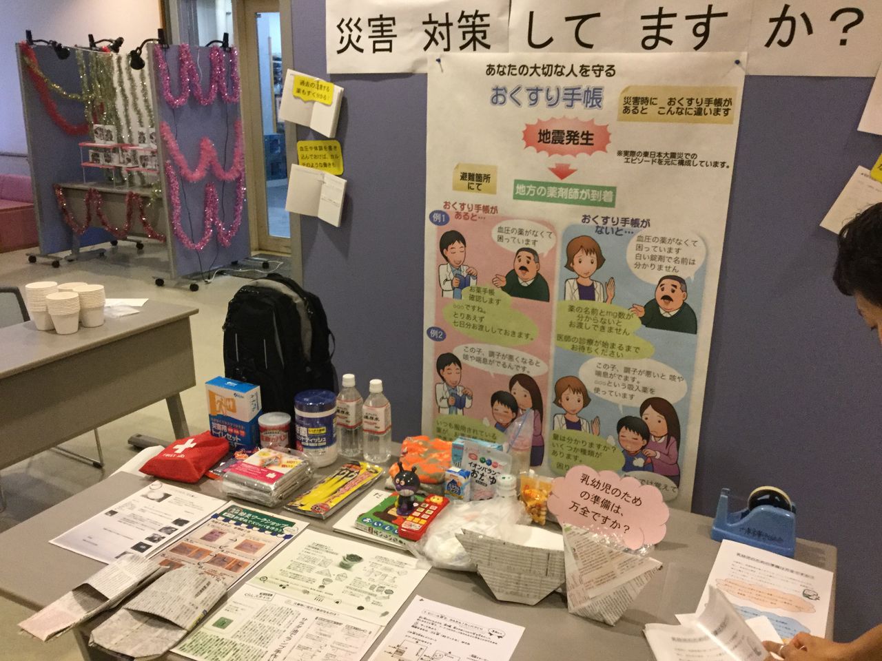 門真市薬剤師会では、災害医療ブース、喫煙防止ブース、空気鉄砲景品ゲットブース、お薬相談ブースを設けました。災害医療ブースでは、 保存食の試食、災害時の備蓄品や古新聞で作った簡易の器やスリッパ等の展示を行い、喫煙防止ブースでは、子ども達にキンエンジャー・スワナイザー顔出しパネルで記念写真を撮っていただきました。