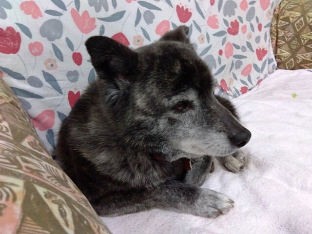 ID33736・甲州市塩山下萩原で保護・雑種または甲斐犬・中型・メス・黒・おとなしい、口元が白い毛で覆われている、前右足にコブがある