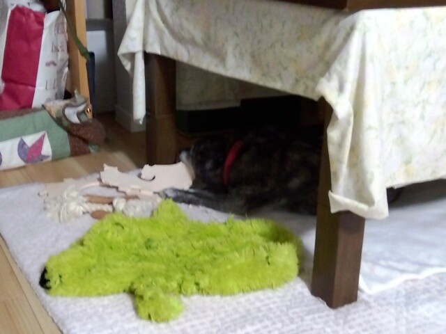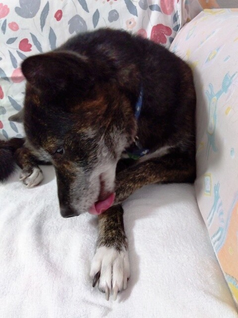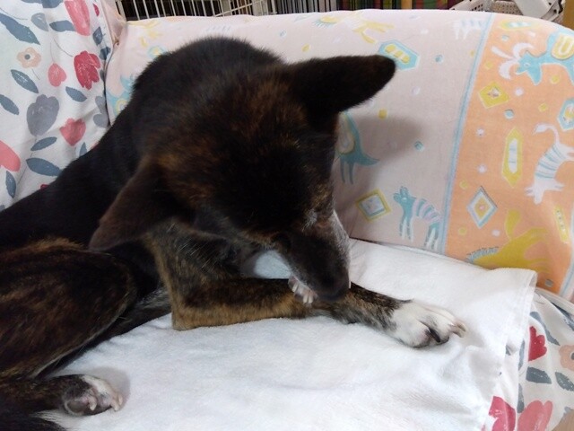 管理番号2510fd001・ 富士市厚原で保護・状況・甲斐系雑種・オス・中・首輪なし・茶黒・立ち耳・巻き尾・マイクロチップなし・後ろの狼爪あり