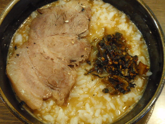 麺を食べ終わったら、1枚残しておいた炭火焼豚とライス¥150を器に投入。