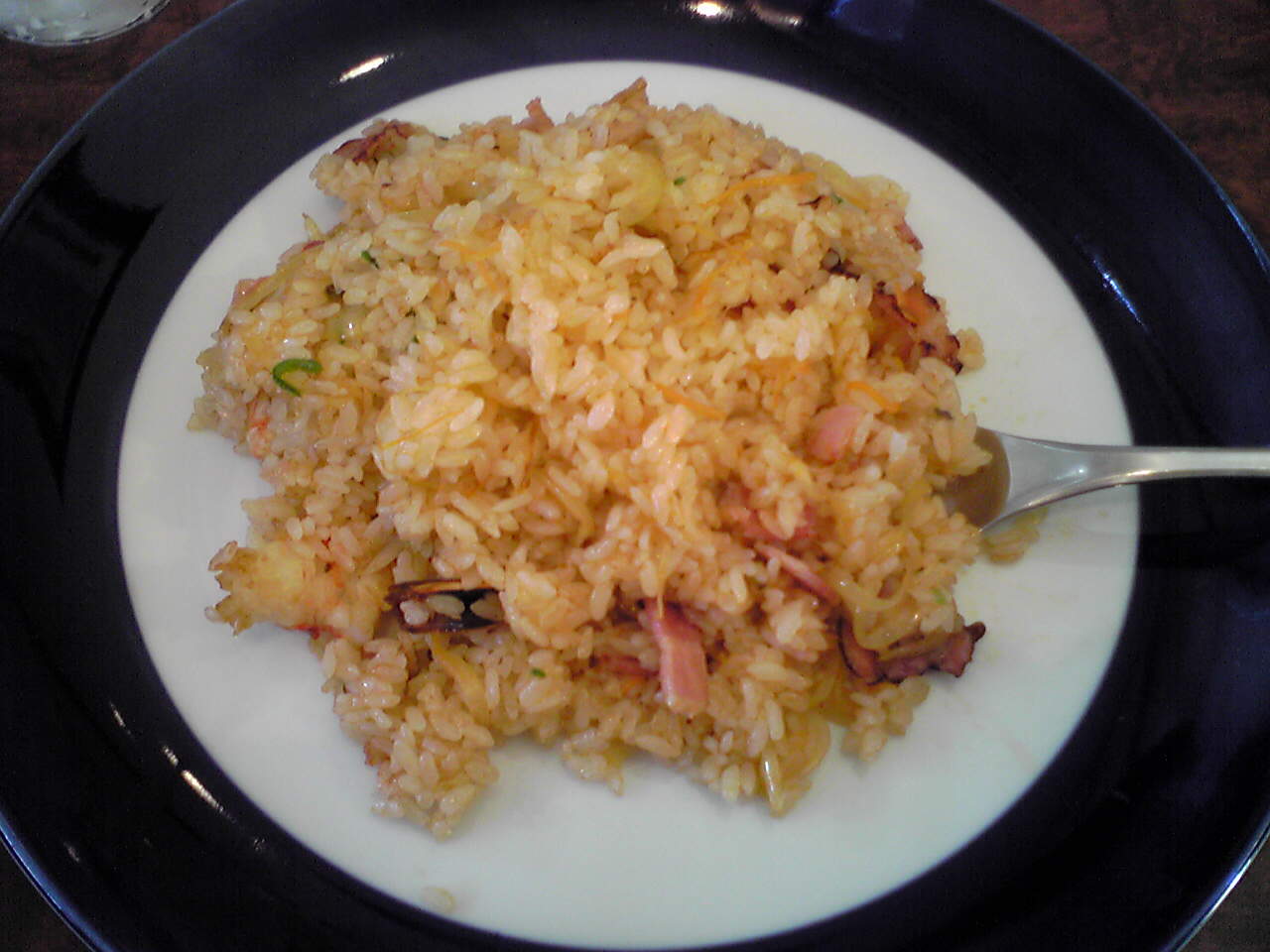 ベーコン・玉ねぎ・ピラフにしては大きめのエビがぶつ切りで入ってます。