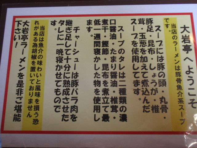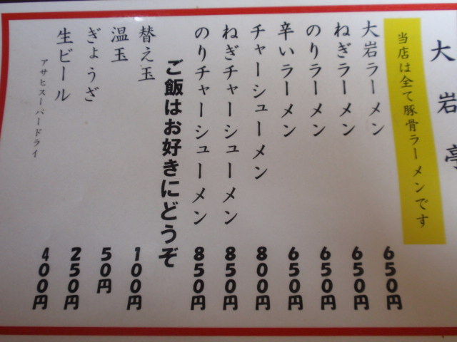 標準の大岩ラーメンをお願いするつもりでしたが、メニューを見るとチャーシューメンのコスパが一番高そうなので其方を。
