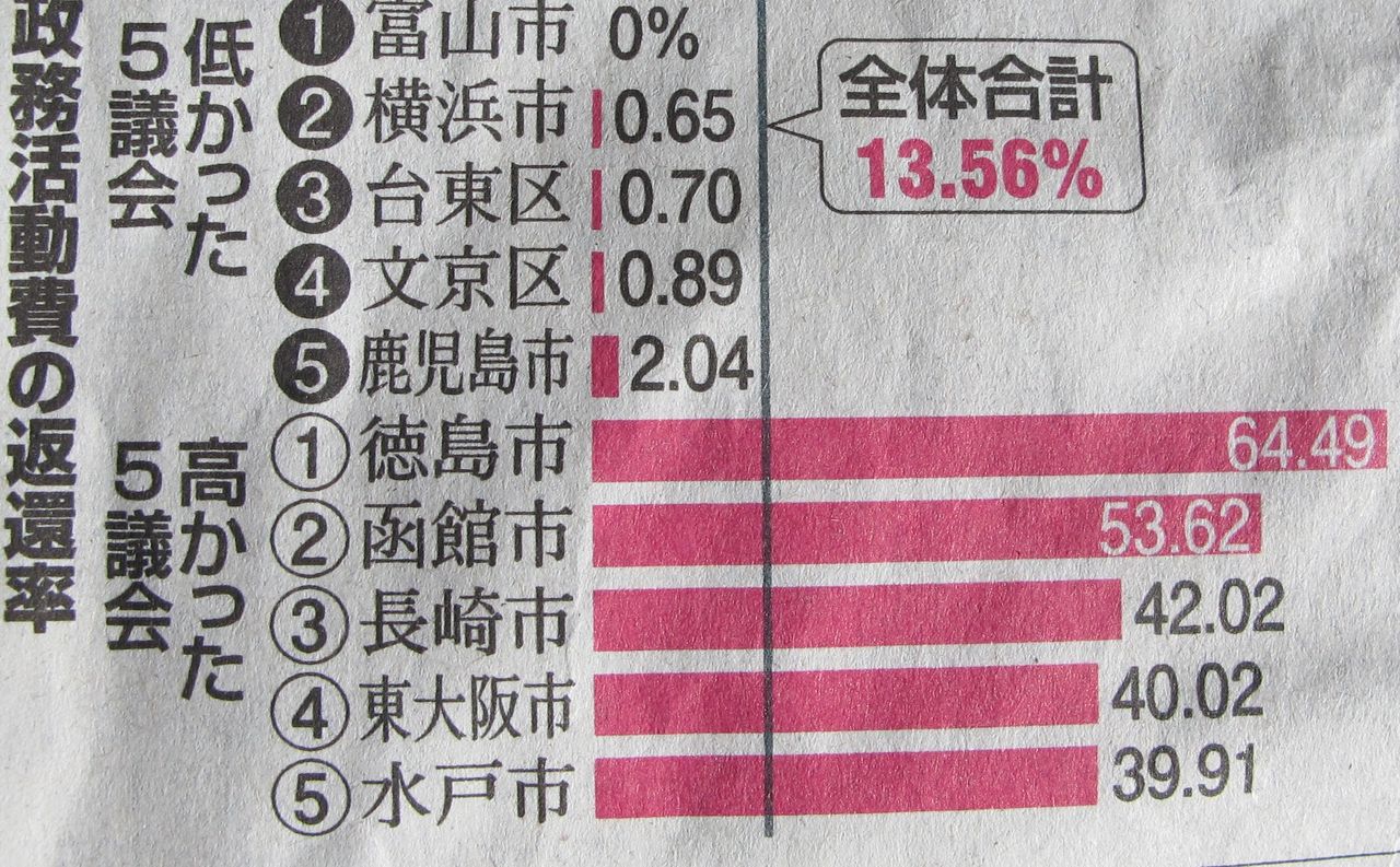 ¤±¤µ¤ÎÄ«Æü¿·Ê¹¤¬¡¢ÃÏÊýµÄ²ñ¤ÎÀ¯Ì³³èưÈñ¤Î»ÙµëÊýË¡¤Ë¤Ä¤¤¤Æ¡¢Á´¹ñ¤ÎÅÔÆ»Éܸ©¡¢À¯Îá»ØÄê»Ô¡¢¸©Ä£½êºß»Ô¡¢Ãæ³Ë»Ô¡¢Åìµþ£²£³¶è¤Î·×£±£´£¸µÄ²ñ¤òÂоݤ˥¢¥ó¥±¡¼¥È¤·¤¿Ä´ºº·ë²Ì¤ò¸øÉ½¤·¤Æ¤¤¤ë¡£