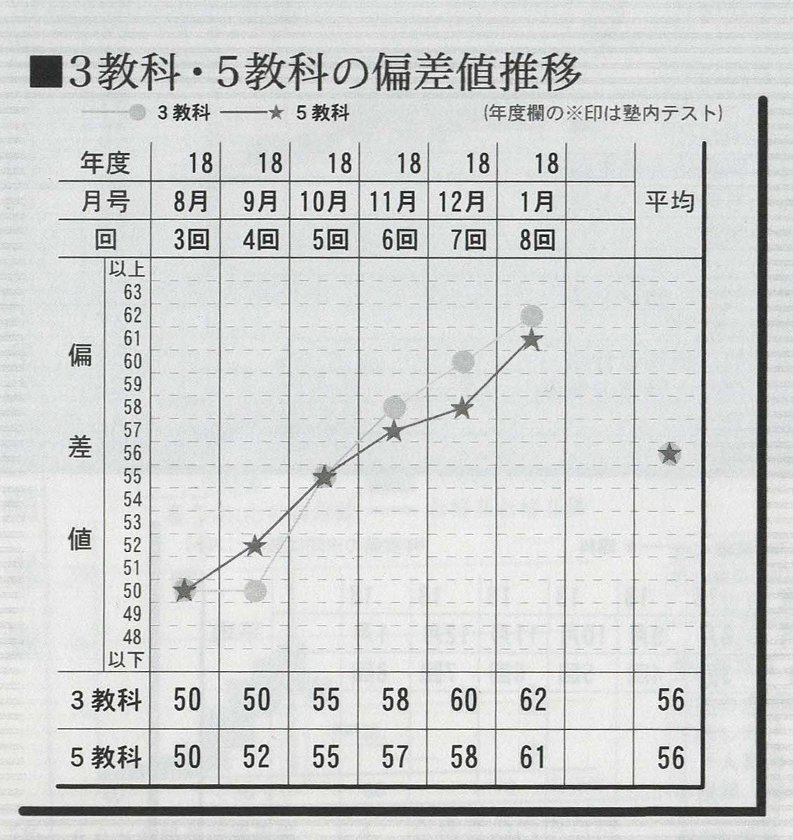 2019年01月22日 最後の追い込み 私立受験が終わり、現在結果が出た生徒は全員合格!そして、本命が公立の生徒は気を抜くことなく、特訓についてきてくれている。先日、受験前最後の業者テストが終わり、前回のブログで紹介した大問1でのくだり、開成ラボ生はさらに正答率を上げ、6問中4問は100%という数字をたたき出した。数多くの演習問題を繰り返し行うアプトプットが重要だということを再確認した。特出すべきは前回同様、色々な成績層の生徒がいて数学が苦手な生徒もここまで頑張ったということだ。アウトプット恐るべし。また、5教科全体の成績もメキメキと上げている。ラスボスである第一志望校を攻略するまであともう少し!<5教科 偏差値50→偏差値61><5教科 偏差値49→偏差値60>勇者である受験生に、ホイミ バイキルトをかけながら私も進んでいく。一緒に頑張ろう!