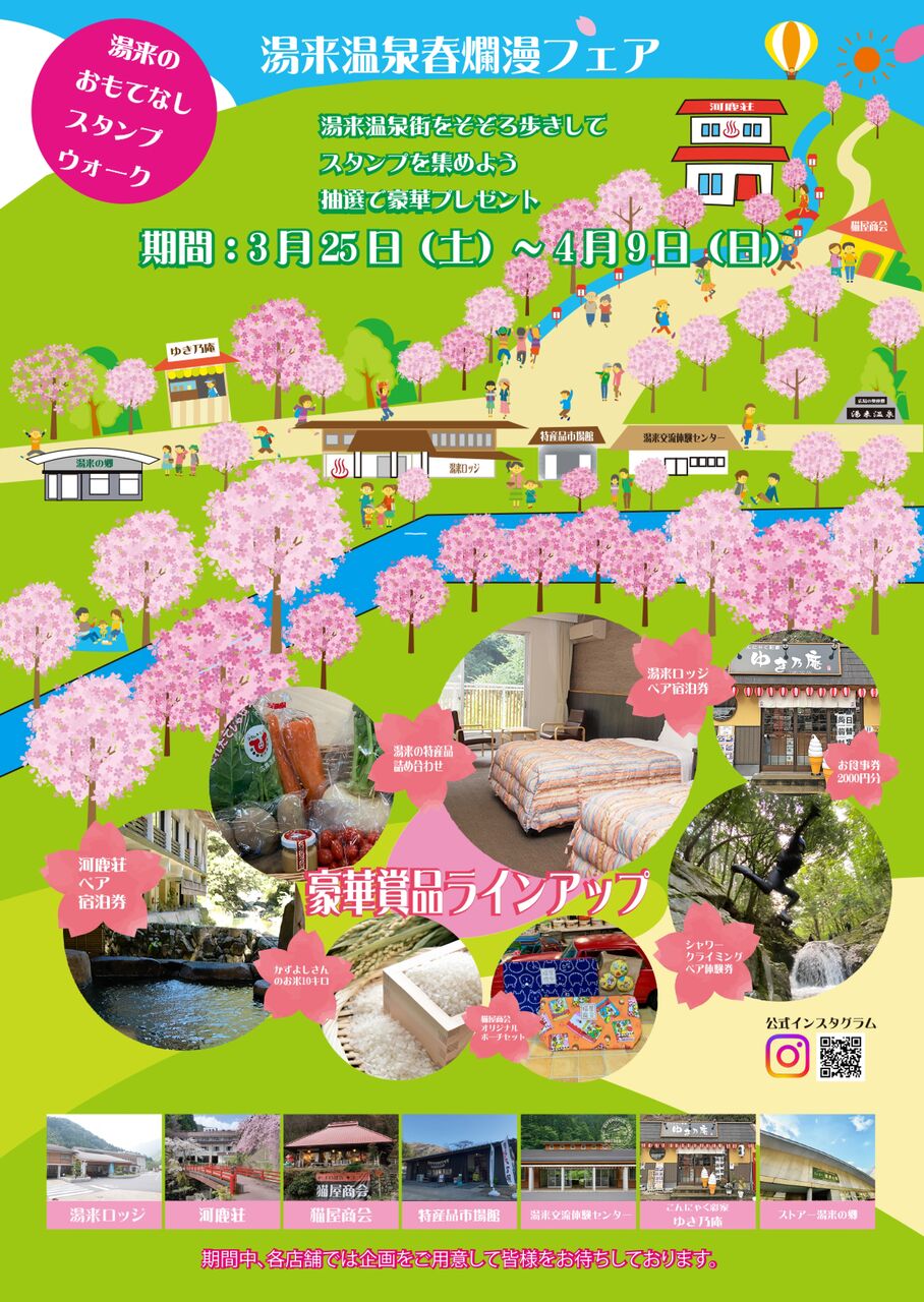 2023年03月25日 湯来温泉春爛漫フェア 本日から約2週間桜の開花に合わせ各店の春のオススメと豪華賞品の当たるスタンプウォークを行っています詳細はの yukinoomotenashi でチェックいただけます皆様様のご参加お待ちしております!