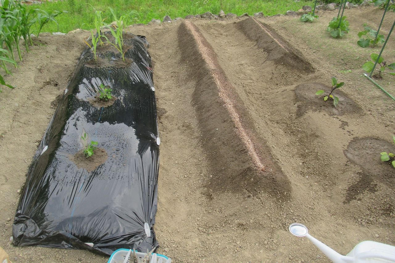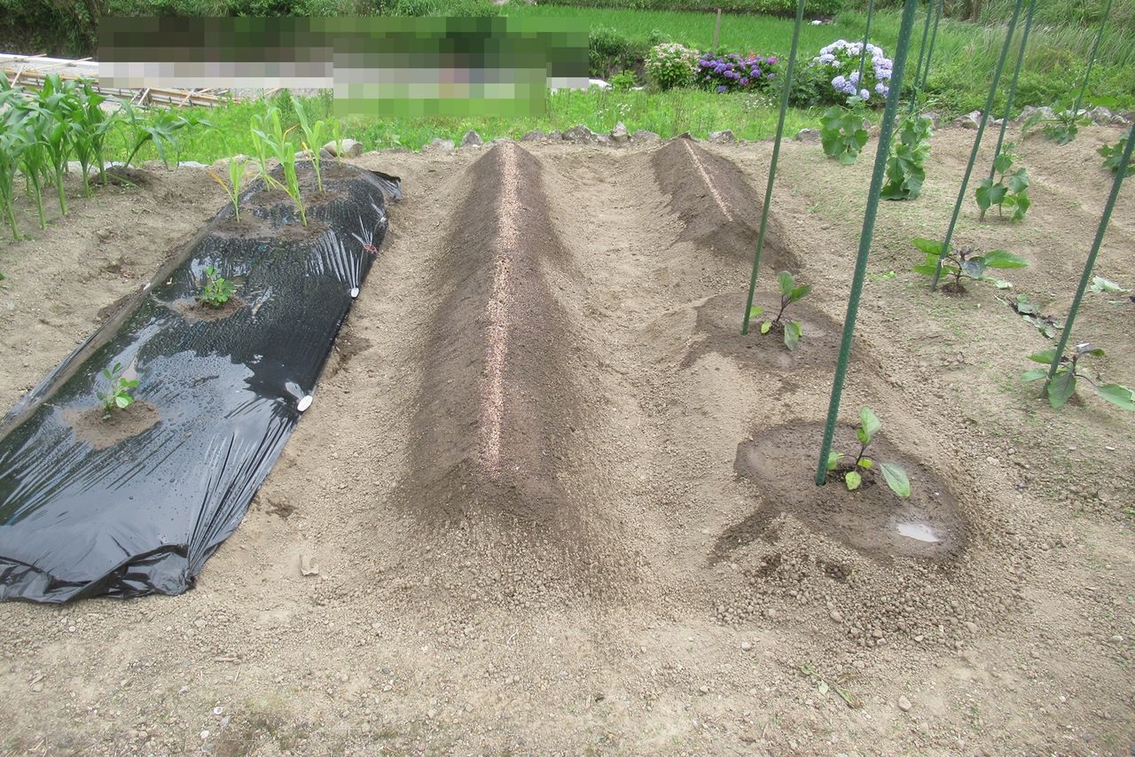 ナスの横、ニンジンは発芽不良なのでつるなしインゲン