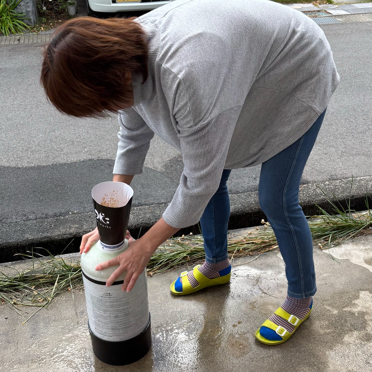 古い樹脂を出す際にけっこう樹脂がこぼれたりするんだが、この樹脂が極小の丸い粒なのでコンクリートの上に散らばっていると足が滑ってめちゃ危ないんですよ。翌日バイクを出す予定もあったのでバイクをコカしたら大被害なので、しっかり洗い流す方が時間がかかったりして、