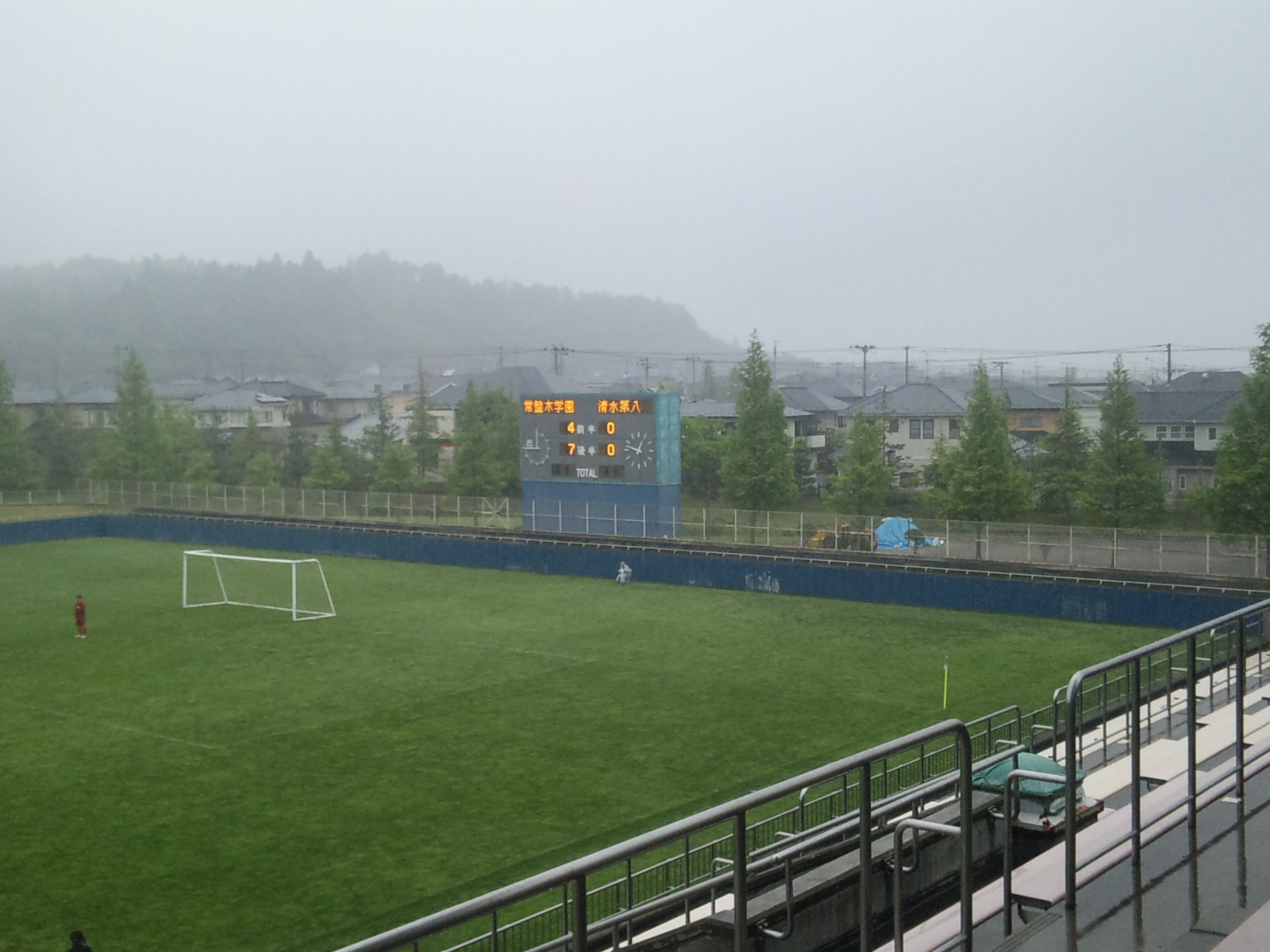 宮城県サッカー場は小雨。・・・服、中にもう一枚着てくればよかったな、という寒さ。ここまで首位の常盤木学園高校が、最下位の清水第八プレアデスを迎え撃つ。
