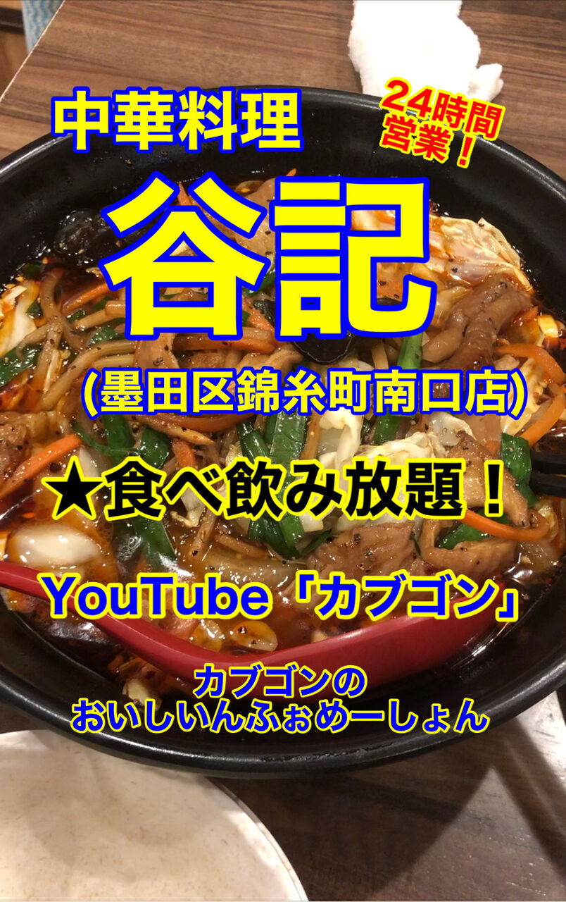 テレビ番組「坂上&指原のつぶれない店」で紹介されたようですね!私は3号店には以前から通っておりましたが、いつの間にか深夜0時に閉まるようになってしまい、それからはあまり行っておりませんでした。しかし、この南口店は24時間営業を貫いておられることを知り、同僚の先生方と行ってきました!ここは単品注文もできますが、食べ放題・飲み放題メニューもあります。ただし、3名以上という条件が付きます。今回は食べ放題&飲み放題でお願いしました(^^♪結論、お腹いっぱいになって退店することになりました(笑)ドリンクも飲みまくったのですが、食べたお料理を挙げますと・・・「バンバンジー」「鶏のから揚げ」「チンジャオロース」「焼き餃子」「辛味ワンタン」「海老チャーハン」「谷記特製チャーハン」「ニンニクチャーハン」「豚肉と卵ときくらげの炒め物」「春巻き」「麻婆ナス」「イカとニンニクの芽炒め」「酢豚」「生姜焼き」「ニラレバ炒め」「車エビとカキオイスターソース炒め」「豚ホルモン麺」です!!3人この量!!食べ過ぎですね(笑)美味しいのと普通なのもありましたが、提供は爆速で満足度が高いお食事でした♪これだけ食べて、飲んで、1名で¥3,599は明らかにリーズナブルです!たぶん単品注文だったら、もっと提供が爆速になると思われます(笑)また行きます!ごっちゃんでした!