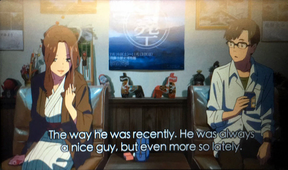 飛騨地方を舞台に展開する旅館のフロントのような壁一面に、この 3枚のポスターが並んで登場します。「瀧が先輩とツカサと飛騨に行った」 シーンです。写真は全体をクリアに見せていませんが、写真をひっかけて下の文字部分のあたりは映像に登場しますよ。まだこれから映画をご覧になる方は、ちょっと気にして見てみて下さい。