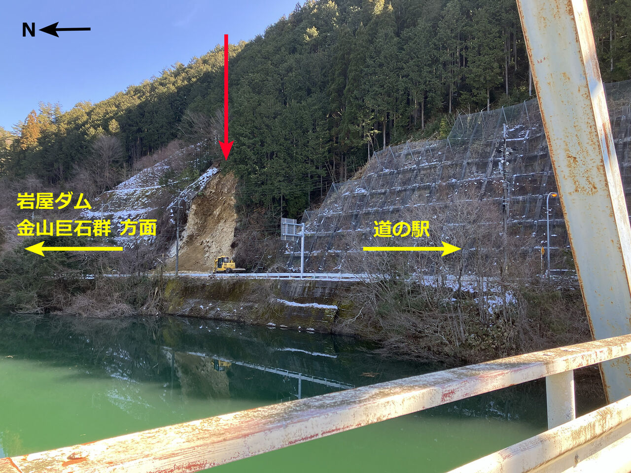 ↓この写真のすぐ左(巨石群の1.4km手前)が、土砂崩れ。