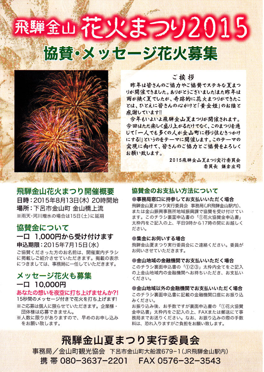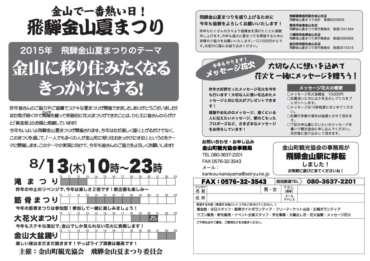 PDF 裏 (花火協賛者一覧/小花火まつり・パレードプログラム/大花火まつりプログラム/金山の夜メシ/交通規制のお知らせ)