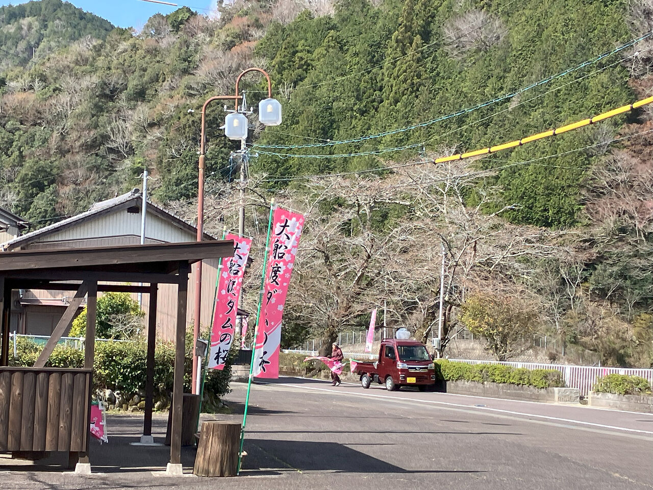 こちらは 大船渡ダムの桜並木 に旗立ての作業中でした。