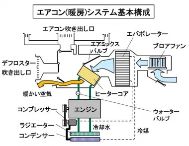 クルマのヒーターは室内にエンジンの冷却水を取り回して風を当てて室内を温める