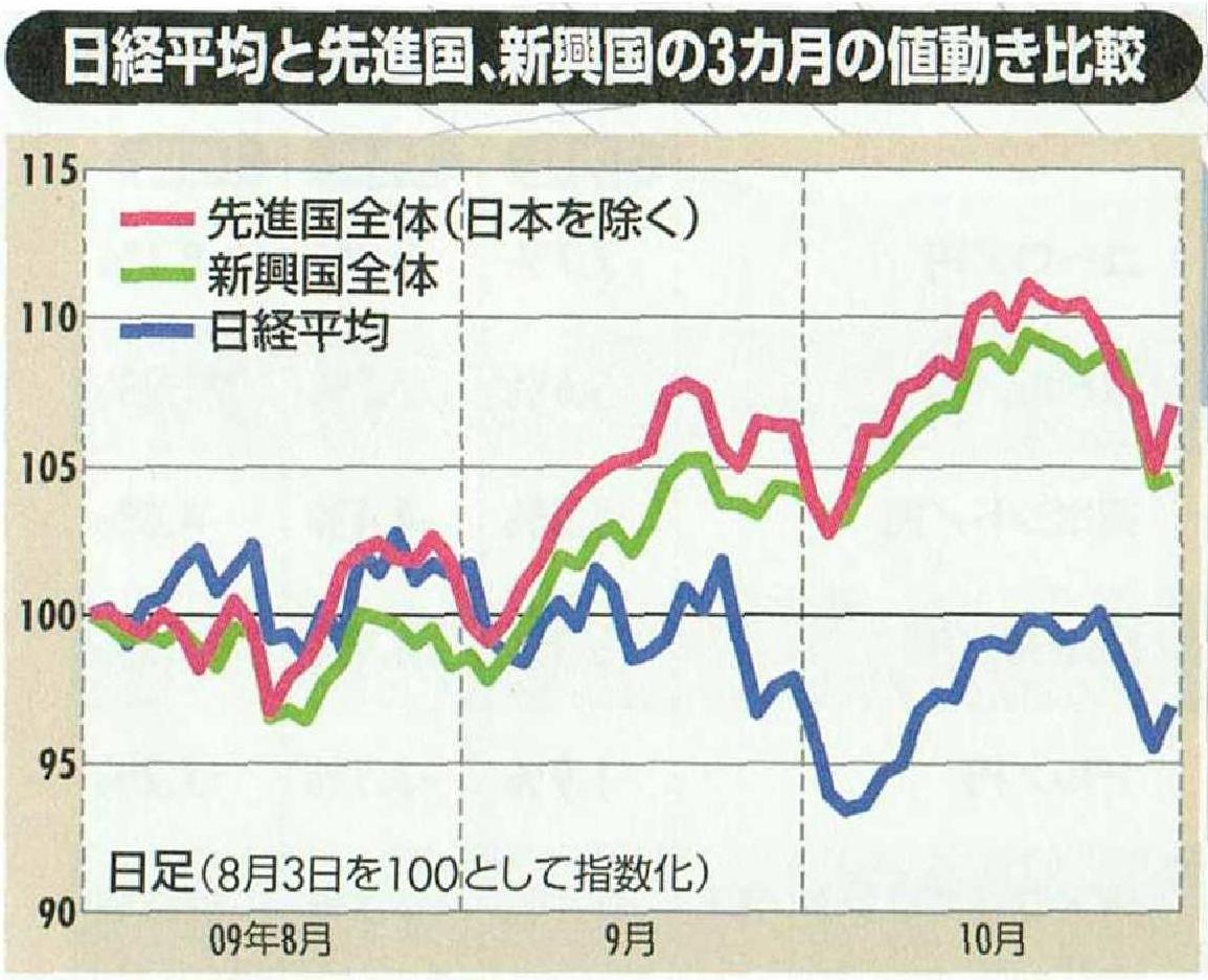写真は、ちょうど民主党に政権が交代した後の日経平均株価の推移です。日経平均株価も8月までは他の国と同じくがんばっていました。