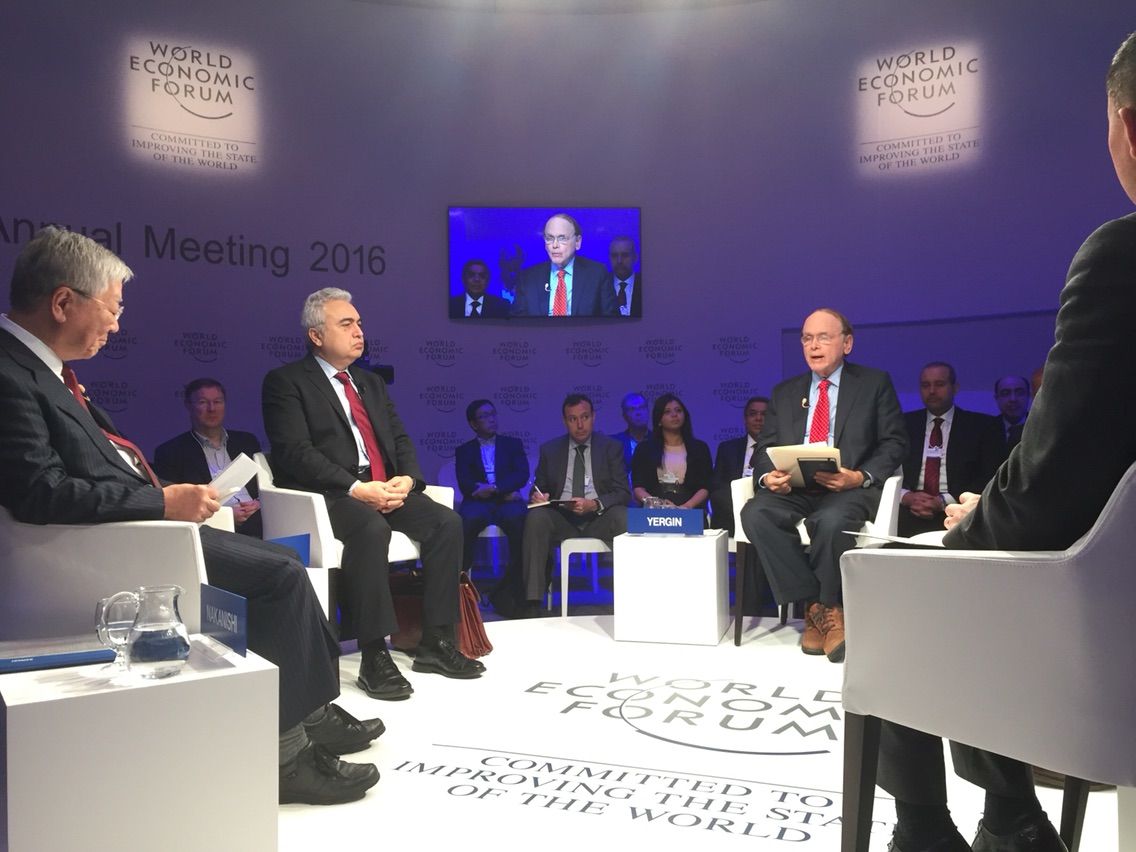 エネルギーについてのセッションの概要です。まるく座ったパネリストを100人で囲む形式。写真左が日立製作所の中西会長。隣がIEA=国際エネルギー機関のバロル事務局長、スクリーンに映し出されているのがモデレーターのダニエル・ヤーギン氏です。